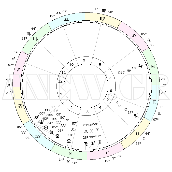 | | ΘΕΣΕΙΣ ΠΛΑΝΗΤΩΝ ΑΣΤΡΟΛΟΓΙΚΟΥ ΧΑΡΤΗ ΤΗΣ ΣΤΙΓΜΗΣ ΑΥΤΗΣ | | | | Πλανήτης | Ζώδιο | Μοίρες | Δεκαήμ. | Σε οίκο | Απόκλιση | | Ακμές των οίκων | | Ηλιος | Υδροχόος | 04°03' | Πρώτο | 2 | 19 S 14 | | 1ος | 02°20' | Τοξότης | | Σελήνη | Κριός | 06°41' | Πρώτο | 4 | 04 N 51 | | 2ος | 03°48' | Αιγόκερως | | Ερμής | Υδροχόος | 05°41' | Πρώτο | 2 | 20 S 52 | | 3ος | 09°54' | Υδροχόος | | Αφροδίτη | Υδροχόος | 08°13' | Πρώτο | 2 | 19 S 23 | | 4ος | 15°59' | Ιχθείς | | Αρης | Υδροχόος | 00°32' | Πρώτο | 2 | 21 S 01 | | 5ος | 16°43' | Κριός | | Δίας | Καρκίνος | 18°18'R | Δεύτερο | 8 | 22 N 28 | | 6ος | 11°27' | Ταύρος | | Κρόνος | Ιχθείς | 28°00' | Τρίτο | 4 | 02 S 48 | | 7ος | 02°20' | Δίδυμοι | | Ουρανός | Ταύρος | 27°31'R | Τρίτο | 6 | 19 N 25 | | 8ος | 03°48' | Καρκίνος | | Ποσειδώνας | Ιχθείς | 29°56' | Τρίτο | 4 | 01 S 14 | | 9ος | 09°54' | Λέων | | Πλούτωνας | Υδροχόος | 03°27' | Πρώτο | 2 | 23 S 04 | | 10ος | 15°59' | Παρθένος | | Β. Δεσμός | Ιχθείς | 10°57' | Δεύτερο | 3 | 07 S 27 | | 11ος | 16°43' | Ζυγός | | Ωροσκόπος | Τοξότης | 02°20' | Πρώτο | | | 12ος | 11°27' | Σκορπιός | | Μεσουράνημα | Παρθένος | 15°59' | Δεύτερο | | | |