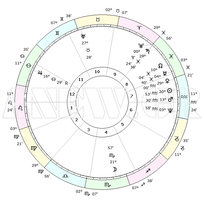 | | ΘΕΣΕΙΣ ΠΛΑΝΗΤΩΝ ΑΣΤΡΟΛΟΓΙΚΟΥ ΧΑΡΤΗ ΤΗΣ ΣΤΙΓΜΗΣ ΑΥΤΗΣ | | | | Πλανήτης | Ζώδιο | Μοίρες | Δεκαήμ. | Σε οίκο | Απόκλιση | | Ακμές των οίκων | | Ηλιος | Υδροχόος | 20°48' | Τρίτο | 8 | 14 S 33 | | 1ος | 21°17' | Καρκίνος | | Σελήνη | Σκορπιός | 21°08' | Τρίτο | 5 | 22 S 51 | | 2ος | 11°52' | Λέων | | Ερμής | Ιχθείς | 04°33' | Πρώτο | 8 | 10 S 45 | | 3ος | 05°46' | Παρθένος | | Αφροδίτη | Υδροχόος | 28°55' | Τρίτο | 8 | 13 S 12 | | 4ος | 05°34' | Ζυγός | | Αρης | Υδροχόος | 13°27' | Δεύτερο | 8 | 17 S 48 | | 5ος | 11°36' | Σκορπιός | | Δίας | Καρκίνος | 16°29'R | Δεύτερο | 12 | 22 N 44 | | 6ος | 18°47' | Τοξότης | | Κρόνος | Ιχθείς | 29°38' | Τρίτο | 9 | 02 S 08 | | 7ος | 21°17' | Αιγόκερως | | Ουρανός | Ταύρος | 27°28' | Τρίτο | 11 | 19 N 25 | | 8ος | 11°52' | Υδροχόος | | Ποσειδώνας | Κριός | 00°24' | Πρώτο | 9 | 01 S 03 | | 9ος | 05°46' | Ιχθείς | | Πλούτωνας | Υδροχόος | 03°58' | Πρώτο | 7 | 22 S 58 | | 10ος | 05°34' | Κριός | | Β. Δεσμός | Ιχθείς | 10°04' | Δεύτερο | 9 | 07 S 47 | | 11ος | 11°36' | Ταύρος | | Ωροσκόπος | Καρκίνος | 21°17' | Τρίτο | | | 12ος | 18°47' | Δίδυμοι | | Μεσουράνημα | Κριός | 05°34' | Πρώτο | | | |