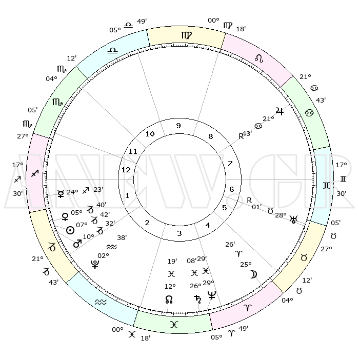 | | ΘΕΣΕΙΣ ΠΛΑΝΗΤΩΝ ΑΣΤΡΟΛΟΓΙΚΟΥ ΧΑΡΤΗ ΤΗΣ ΣΤΙΓΜΗΣ ΑΥΤΗΣ | | | | Πλανήτης | Ζώδιο | Μοίρες | Δεκαήμ. | Σε οίκο | Απόκλιση | | Ακμές των οίκων | | Ηλιος | Αιγόκερως | 07°33' | Πρώτο | 3 | 23 S 13 | | 1ος | 03°52' | Σκορπιός | | Σελήνη | Κριός | 23°20' | Τρίτο | 6 | 12 N 14 | | 2ος | 02°31' | Τοξότης | | Ερμής | Τοξότης | 24°09' | Τρίτο | 2 | 23 S 32 | | 3ος | 04°48' | Αιγόκερως | | Αφροδίτη | Αιγόκερως | 05°29' | Πρώτο | 3 | 23 S 43 | | 4ος | 09°15' | Υδροχόος | | Αρης | Αιγόκερως | 10°25' | Δεύτερο | 3 | 23 S 54 | | 5ος | 12°07' | Ιχθείς | | Δίας | Καρκίνος | 21°44'R | Τρίτο | 9 | 21 N 54 | | 6ος | 10°25' | Κριός | | Κρόνος | Ιχθείς | 26°07' | Τρίτο | 5 | 03 S 38 | | 7ος | 03°52' | Ταύρος | | Ουρανός | Ταύρος | 28°02'R | Τρίτο | 7 | 19 N 31 | | 8ος | 02°31' | Δίδυμοι | | Ποσειδώνας | Ιχθείς | 29°28' | Τρίτο | 5 | 01 S 26 | | 9ος | 04°48' | Καρκίνος | | Πλούτωνας | Υδροχόος | 02°38' | Πρώτο | 3 | 23 S 14 | | 10ος | 09°15' | Λέων | | Β. Δεσμός | Ιχθείς | 12°20' | Δεύτερο | 5 | 06 S 56 | | 11ος | 12°07' | Παρθένος | | Ωροσκόπος | Σκορπιός | 03°52' | Πρώτο | | | 12ος | 10°25' | Ζυγός | | Μεσουράνημα | Λέων | 09°15' | Πρώτο | | | |