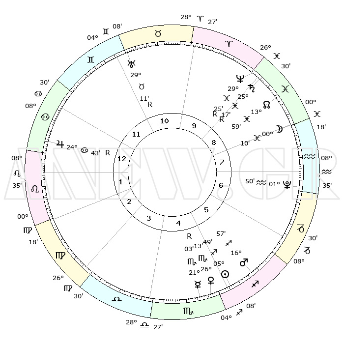 | | ΘΕΣΕΙΣ ΠΛΑΝΗΤΩΝ ΑΣΤΡΟΛΟΓΙΚΟΥ ΧΑΡΤΗ ΤΗΣ ΣΤΙΓΜΗΣ ΑΥΤΗΣ | | | | Πλανήτης | Ζώδιο | Μοίρες | Δεκαήμ. | Σε οίκο | Απόκλιση | | Ακμές των οίκων | | Ηλιος | Τοξότης | 05°47' | Πρώτο | 5 | 21 S 16 | | 1ος | 29°42' | Καρκίνος | | Σελήνη | Υδροχόος | 29°46' | Τρίτο | 8 | 12 S 44 | | 2ος | 20°43' | Λέων | | Ερμής | Σκορπιός | 21°03'R | Τρίτο | 4 | 15 S 44 | | 3ος | 15°43' | Παρθένος | | Αφροδίτη | Σκορπιός | 26°11' | Τρίτο | 5 | 18 S 30 | | 4ος | 16°43' | Ζυγός | | Αρης | Τοξότης | 16°56' | Δεύτερο | 5 | 23 S 25 | | 5ος | 22°46' | Σκορπιός | | Δίας | Καρκίνος | 24°43'R | Τρίτο | 12 | 21 N 20 | | 6ος | 28°31' | Τοξότης | | Κρόνος | Ιχθείς | 25°17'R | Τρίτο | 9 | 04 S 04 | | 7ος | 29°42' | Αιγόκερως | | Ουρανός | Ταύρος | 29°11'R | Τρίτο | 11 | 19 N 46 | | 8ος | 20°43' | Υδροχόος | | Ποσειδώνας | Ιχθείς | 29°25'R | Τρίτο | 9 | 01 S 29 | | 9ος | 15°43' | Ιχθείς | | Πλούτωνας | Υδροχόος | 01°50' | Πρώτο | 7 | 23 S 25 | | 10ος | 16°43' | Κριός | | Β. Δεσμός | Ιχθείς | 13°59' | Δεύτερο | 8 | 06 S 18 | | 11ος | 22°46' | Ταύρος | | Ωροσκόπος | Καρκίνος | 29°42' | Τρίτο | | | 12ος | 28°31' | Δίδυμοι | | Μεσουράνημα | Κριός | 16°43' | Δεύτερο | | | |