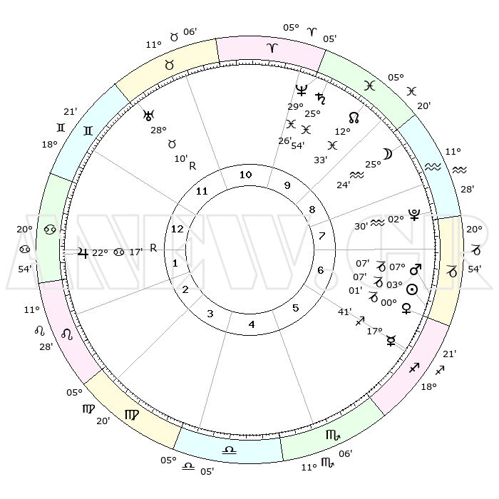| | ΘΕΣΕΙΣ ΠΛΑΝΗΤΩΝ ΑΣΤΡΟΛΟΓΙΚΟΥ ΧΑΡΤΗ ΤΗΣ ΣΤΙΓΜΗΣ ΑΥΤΗΣ | | | | Πλανήτης | Ζώδιο | Μοίρες | Δεκαήμ. | Σε οίκο | Απόκλιση | | Ακμές των οίκων | | Ηλιος | Αιγόκερως | 03°02' | Πρώτο | 7 | 23 S 24 | | 1ος | 24°56' | Δίδυμοι | | Σελήνη | Υδροχόος | 24°22' | Τρίτο | 9 | 14 S 47 | | 2ος | 16°06' | Καρκίνος | | Ερμής | Τοξότης | 17°33' | Δεύτερο | 6 | 22 S 33 | | 3ος | 07°37' | Λέων | | Αφροδίτη | Τοξότης | 29°55' | Τρίτο | 7 | 23 S 39 | | 4ος | 03°09' | Παρθένος | | Αρης | Αιγόκερως | 07°03' | Πρώτο | 7 | 24 S 05 | | 5ος | 06°14' | Ζυγός | | Δίας | Καρκίνος | 22°17'R | Τρίτο | 2 | 21 N 48 | | 6ος | 16°29' | Σκορπιός | | Κρόνος | Ιχθείς | 25°54' | Τρίτο | 10 | 03 S 44 | | 7ος | 24°56' | Τοξότης | | Ουρανός | Ταύρος | 28°10'R | Τρίτο | 12 | 19 N 33 | | 8ος | 16°06' | Αιγόκερως | | Ποσειδώνας | Ιχθείς | 29°26' | Τρίτο | 10 | 01 S 27 | | 9ος | 07°37' | Υδροχόος | | Πλούτωνας | Υδροχόος | 02°30' | Πρώτο | 8 | 23 S 16 | | 10ος | 03°09' | Ιχθείς | | Β. Δεσμός | Ιχθείς | 12°34' | Δεύτερο | 10 | 06 S 51 | | 11ος | 06°14' | Κριός | | Ωροσκόπος | Δίδυμοι | 24°56' | Τρίτο | | | 12ος | 16°29' | Ταύρος | | Μεσουράνημα | Ιχθείς | 03°09' | Πρώτο | | | |