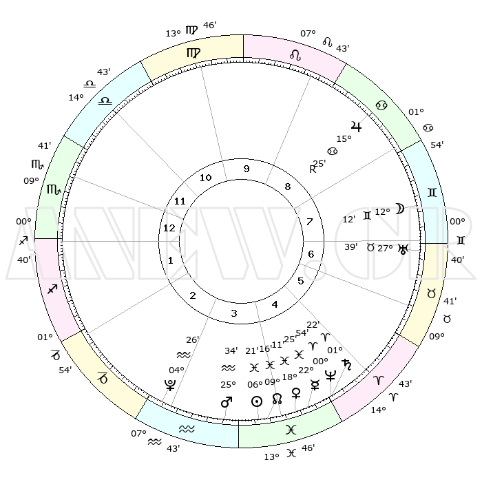 | | ΘΕΣΕΙΣ ΠΛΑΝΗΤΩΝ ΑΣΤΡΟΛΟΓΙΚΟΥ ΧΑΡΤΗ ΤΗΣ ΣΤΙΓΜΗΣ ΑΥΤΗΣ | | | | Πλανήτης | Ζώδιο | Μοίρες | Δεκαήμ. | Σε οίκο | Απόκλιση | | Ακμές των οίκων | | Ηλιος | Ιχθείς | 06°18' | Πρώτο | 4 | 09 S 12 | | 1ος | 14°56' | Σκορπιός | | Σελήνη | Δίδυμοι | 11°25' | Δεύτερο | 7 | 27 N 22 | | 2ος | 14°25' | Τοξότης | | Ερμής | Ιχθείς | 22°25' | Τρίτο | 4 | 00 S 44 | | 3ος | 17°53' | Αιγόκερως | | Αφροδίτη | Ιχθείς | 18°07' | Δεύτερο | 4 | 06 S 00 | | 4ος | 23°09' | Υδροχόος | | Αρης | Υδροχόος | 25°32' | Τρίτο | 4 | 14 S 02 | | 5ος | 25°35' | Ιχθείς | | Δίας | Καρκίνος | 15°25'R | Δεύτερο | 8 | 22 N 53 | | 6ος | 22°38' | Κριός | | Κρόνος | Κριός | 01°21' | Πρώτο | 5 | 01 S 25 | | 7ος | 14°56' | Ταύρος | | Ουρανός | Ταύρος | 27°39' | Τρίτο | 7 | 19 N 27 | | 8ος | 14°25' | Δίδυμοι | | Ποσειδώνας | Κριός | 00°54' | Πρώτο | 5 | 00 S 50 | | 9ος | 17°53' | Καρκίνος | | Πλούτωνας | Υδροχόος | 04°25' | Πρώτο | 3 | 22 S 54 | | 10ος | 23°09' | Λέων | | Β. Δεσμός | Ιχθείς | 09°16' | Πρώτο | 4 | 08 S 06 | | 11ος | 25°35' | Παρθένος | | Ωροσκόπος | Σκορπιός | 14°56' | Δεύτερο | | | 12ος | 22°38' | Ζυγός | | Μεσουράνημα | Λέων | 23°09' | Τρίτο | | | |