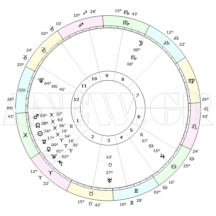 | | ΘΕΣΕΙΣ ΠΛΑΝΗΤΩΝ ΑΣΤΡΟΛΟΓΙΚΟΥ ΧΑΡΤΗ ΤΗΣ ΣΤΙΓΜΗΣ ΑΥΤΗΣ | | | | Πλανήτης | Ζώδιο | Μοίρες | Δεκαήμ. | Σε οίκο | Απόκλιση | | Ακμές των οίκων | | Ηλιος | Ιχθείς | 16°28' | Δεύτερο | 2 | 05 S 20 | | 1ος | 05°37' | Αιγόκερως | | Σελήνη | Ζυγός | 28°32' | Τρίτο | 10 | 14 S 42 | | 2ος | 14°12' | Υδροχόος | | Ερμής | Ιχθείς | 17°18'R | Δεύτερο | 2 | 01 S 39 | | 3ος | 24°28' | Ιχθείς | | Αφροδίτη | Κριός | 00°45' | Πρώτο | 3 | 00 S 51 | | 4ος | 27°27' | Κριός | | Αρης | Ιχθείς | 03°31' | Πρώτο | 2 | 11 S 14 | | 5ος | 22°55' | Ταύρος | | Δίας | Καρκίνος | 15°07'R | Δεύτερο | 7 | 22 N 56 | | 6ος | 14°24' | Δίδυμοι | | Κρόνος | Κριός | 02°34' | Πρώτο | 3 | 00 S 56 | | 7ος | 05°37' | Καρκίνος | | Ουρανός | Ταύρος | 27°53' | Τρίτο | 5 | 19 N 30 | | 8ος | 14°12' | Λέων | | Ποσειδώνας | Κριός | 01°16' | Πρώτο | 3 | 00 S 42 | | 9ος | 24°28' | Παρθένος | | Πλούτωνας | Υδροχόος | 04°42' | Πρώτο | 1 | 22 S 51 | | 10ος | 27°27' | Ζυγός | | Β. Δεσμός | Ιχθείς | 08°44' | Πρώτο | 2 | 08 S 18 | | 11ος | 22°55' | Σκορπιός | | Ωροσκόπος | Αιγόκερως | 05°37' | Πρώτο | | | 12ος | 14°24' | Τοξότης | | Μεσουράνημα | Ζυγός | 27°27' | Τρίτο | | | |