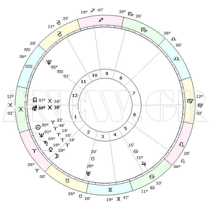 | | ΘΕΣΕΙΣ ΠΛΑΝΗΤΩΝ ΑΣΤΡΟΛΟΓΙΚΟΥ ΧΑΡΤΗ ΤΗΣ ΣΤΙΓΜΗΣ ΑΥΤΗΣ | | | | Πλανήτης | Ζώδιο | Μοίρες | Δεκαήμ. | Σε οίκο | Απόκλιση | | Ακμές των οίκων | | Ηλιος | Κριός | 00°28' | Πρώτο | 2 | 00 N 11 | | 1ος | 02°04' | Υδροχόος | | Σελήνη | Κριός | 27°10' | Τρίτο | 3 | 14 N 07 | | 2ος | 16°29' | Ιχθείς | | Ερμής | Ιχθείς | 08°30' | Πρώτο | 1 | 07 S 32 | | 3ος | 24°36' | Κριός | | Αφροδίτη | Κριός | 18°10' | Δεύτερο | 2 | 06 N 20 | | 4ος | 22°43' | Ταύρος | | Αρης | Ιχθείς | 14°34' | Δεύτερο | 1 | 07 S 04 | | 5ος | 15°20' | Δίδυμοι | | Δίας | Καρκίνος | 15°15' | Δεύτερο | 6 | 22 N 55 | | 6ος | 06°50' | Καρκίνος | | Κρόνος | Κριός | 04°18' | Πρώτο | 2 | 00 S 15 | | 7ος | 02°04' | Λέων | | Ουρανός | Ταύρος | 28°19' | Τρίτο | 4 | 19 N 37 | | 8ος | 16°29' | Παρθένος | | Ποσειδώνας | Κριός | 01°48' | Πρώτο | 2 | 00 S 29 | | 9ος | 24°36' | Ζυγός | | Πλούτωνας | Υδροχόος | 05°01' | Πρώτο | 1 | 22 S 48 | | 10ος | 22°43' | Σκορπιός | | Β. Δεσμός | Ιχθείς | 07°59' | Πρώτο | 1 | 08 S 34 | | 11ος | 15°20' | Τοξότης | | Ωροσκόπος | Υδροχόος | 02°04' | Πρώτο | | | 12ος | 06°50' | Αιγόκερως | | Μεσουράνημα | Σκορπιός | 22°43' | Τρίτο | | | |