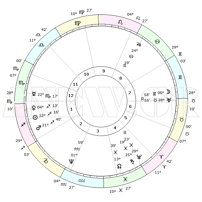 | | ΘΕΣΕΙΣ ΠΛΑΝΗΤΩΝ ΑΣΤΡΟΛΟΓΙΚΟΥ ΧΑΡΤΗ ΤΗΣ ΣΤΙΓΜΗΣ ΑΥΤΗΣ | | | | Πλανήτης | Ζώδιο | Μοίρες | Δεκαήμ. | Σε οίκο | Απόκλιση | | Ακμές των οίκων | | Ηλιος | Τοξότης | 12°14' | Δεύτερο | 1 | 22 S 15 | | 1ος | 20°42' | Σκορπιός | | Σελήνη | Δίδυμοι | 00°35' | Πρώτο | 7 | 25 N 01 | | 2ος | 20°43' | Τοξότης | | Ερμής | Σκορπιός | 22°16' | Τρίτο | 1 | 15 S 50 | | 3ος | 24°58' | Αιγόκερως | | Αφροδίτη | Τοξότης | 04°11' | Πρώτο | 1 | 20 S 24 | | 4ος | 00°37' | Ιχθείς | | Αρης | Τοξότης | 21°39' | Τρίτο | 2 | 23 S 51 | | 5ος | 02°38' | Κριός | | Δίας | Καρκίνος | 24°19'R | Τρίτο | 8 | 21 N 25 | | 6ος | 28°56' | Κριός | | Κρόνος | Ιχθείς | 25°19' | Τρίτο | 4 | 04 S 02 | | 7ος | 20°42' | Ταύρος | | Ουρανός | Ταύρος | 28°55'R | Τρίτο | 7 | 19 N 43 | | 8ος | 20°43' | Δίδυμοι | | Ποσειδώνας | Ιχθείς | 29°23'R | Τρίτο | 4 | 01 S 29 | | 9ος | 24°58' | Καρκίνος | | Πλούτωνας | Υδροχόος | 01°59' | Πρώτο | 3 | 23 S 23 | | 10ος | 00°37' | Παρθένος | | Β. Δεσμός | Ιχθείς | 13°39' | Δεύτερο | 4 | 06 S 26 | | 11ος | 02°38' | Ζυγός | | Ωροσκόπος | Σκορπιός | 20°42' | Τρίτο | | | 12ος | 28°56' | Ζυγός | | Μεσουράνημα | Παρθένος | 00°37' | Πρώτο | | | |