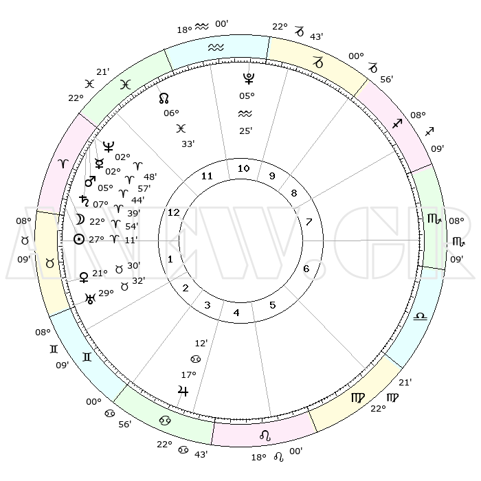 | | ΘΕΣΕΙΣ ΠΛΑΝΗΤΩΝ ΑΣΤΡΟΛΟΓΙΚΟΥ ΧΑΡΤΗ ΤΗΣ ΣΤΙΓΜΗΣ ΑΥΤΗΣ | | | | Πλανήτης | Ζώδιο | Μοίρες | Δεκαήμ. | Σε οίκο | Απόκλιση | | Ακμές των οίκων | | Ηλιος | Κριός | 27°08' | Τρίτο | 1 | 10 N 27 | | 1ος | 11°22' | Κριός | | Σελήνη | Κριός | 22°12' | Τρίτο | 1 | 11 N 57 | | 2ος | 18°44' | Ταύρος | | Ερμής | Κριός | 02°52' | Πρώτο | 12 | 01 S 16 | | 3ος | 14°30' | Δίδυμοι | | Αφροδίτη | Ταύρος | 21°26' | Τρίτο | 2 | 18 N 23 | | 4ος | 06°25' | Καρκίνος | | Αρης | Κριός | 05°42' | Πρώτο | 12 | 01 N 22 | | 5ος | 29°19' | Καρκίνος | | Δίας | Καρκίνος | 17°11' | Δεύτερο | 4 | 22 N 42 | | 6ος | 28°34' | Λέων | | Κρόνος | Κριός | 07°39' | Πρώτο | 12 | 01 N 03 | | 7ος | 11°22' | Ζυγός | | Ουρανός | Ταύρος | 29°32' | Τρίτο | 2 | 19 N 53 | | 8ος | 18°44' | Σκορπιός | | Ποσειδώνας | Κριός | 02°48' | Πρώτο | 12 | 00 S 06 | | 9ος | 14°30' | Τοξότης | | Πλούτωνας | Υδροχόος | 05°25' | Πρώτο | 11 | 22 S 47 | | 10ος | 06°25' | Αιγόκερως | | Β. Δεσμός | Ιχθείς | 06°33' | Πρώτο | 12 | 09 S 06 | | 11ος | 29°19' | Αιγόκερως | | Ωροσκόπος | Κριός | 11°22' | Δεύτερο | | | 12ος | 28°34' | Υδροχόος | | Μεσουράνημα | Αιγόκερως | 06°25' | Πρώτο | | | |