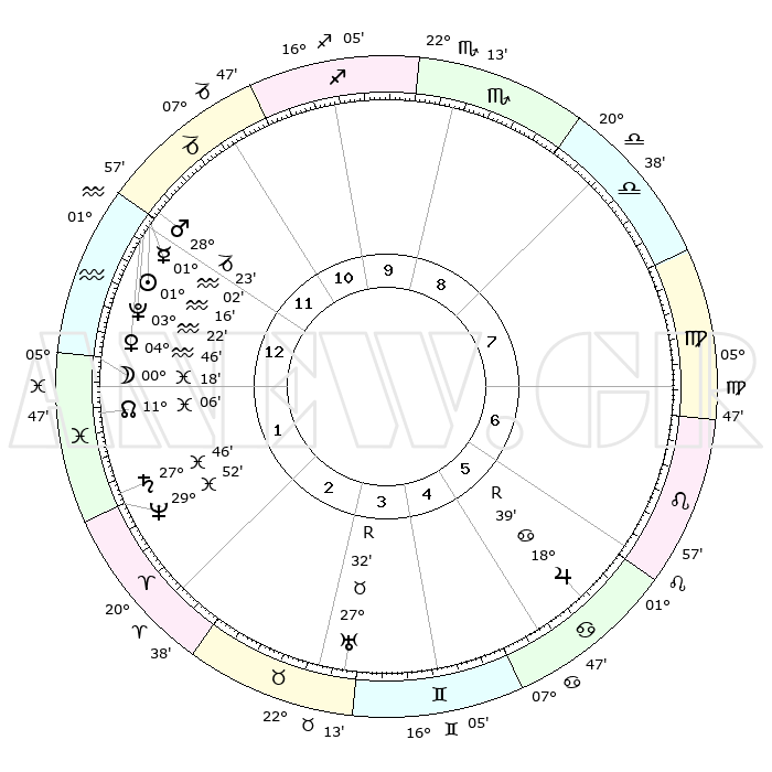 | | ΘΕΣΕΙΣ ΠΛΑΝΗΤΩΝ ΑΣΤΡΟΛΟΓΙΚΟΥ ΧΑΡΤΗ ΤΗΣ ΣΤΙΓΜΗΣ ΑΥΤΗΣ | | | | Πλανήτης | Ζώδιο | Μοίρες | Δεκαήμ. | Σε οίκο | Απόκλιση | | Ακμές των οίκων | | Ηλιος | Υδροχόος | 01°11' | Πρώτο | 1 | 19 S 53 | | 1ος | 28°31' | Αιγόκερως | | Σελήνη | Υδροχόος | 29°18' | Τρίτο | 1 | 12 S 34 | | 2ος | 12°22' | Ιχθείς | | Ερμής | Υδροχόος | 00°54' | Πρώτο | 1 | 21 S 57 | | 3ος | 21°02' | Κριός | | Αφροδίτη | Υδροχόος | 04°40' | Πρώτο | 1 | 20 S 12 | | 4ος | 19°46' | Ταύρος | | Αρης | Αιγόκερως | 28°20' | Τρίτο | 12 | 21 S 28 | | 5ος | 12°38' | Δίδυμοι | | Δίας | Καρκίνος | 18°39'R | Δεύτερο | 6 | 22 N 25 | | 6ος | 04°00' | Καρκίνος | | Κρόνος | Ιχθείς | 27°46' | Τρίτο | 2 | 02 S 55 | | 7ος | 28°31' | Καρκίνος | | Ουρανός | Ταύρος | 27°32'R | Τρίτο | 4 | 19 N 25 | | 8ος | 12°22' | Παρθένος | | Ποσειδώνας | Ιχθείς | 29°52' | Τρίτο | 2 | 01 S 16 | | 9ος | 21°02' | Ζυγός | | Πλούτωνας | Υδροχόος | 03°21' | Πρώτο | 1 | 23 S 05 | | 10ος | 19°46' | Σκορπιός | | Β. Δεσμός | Ιχθείς | 11°06' | Δεύτερο | 1 | 07 S 24 | | 11ος | 12°38' | Τοξότης | | Ωροσκόπος | Αιγόκερως | 28°31' | Τρίτο | | | 12ος | 04°00' | Αιγόκερως | | Μεσουράνημα | Σκορπιός | 19°46' | Δεύτερο | | | |
