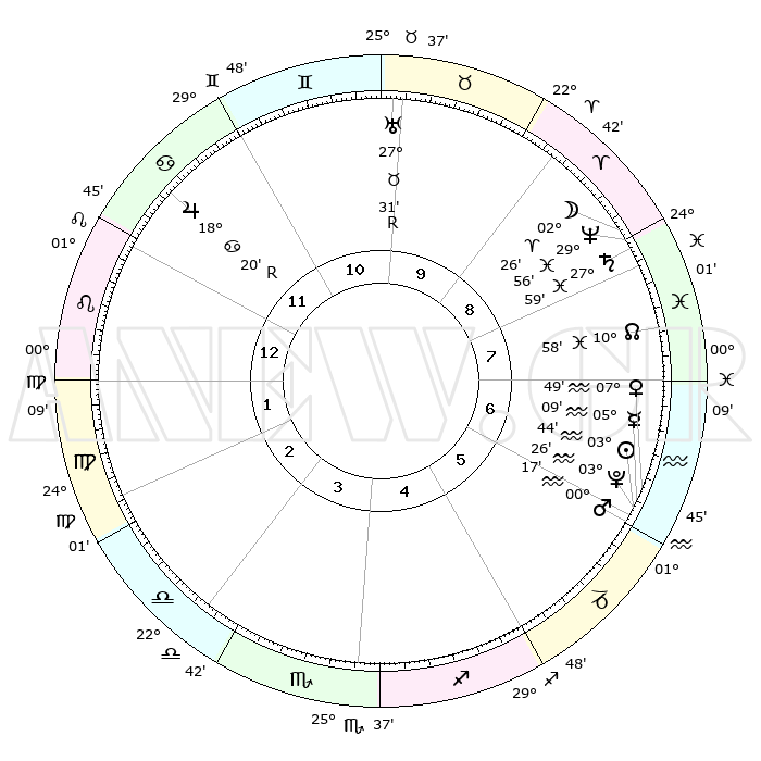 | | ΘΕΣΕΙΣ ΠΛΑΝΗΤΩΝ ΑΣΤΡΟΛΟΓΙΚΟΥ ΧΑΡΤΗ ΤΗΣ ΣΤΙΓΜΗΣ ΑΥΤΗΣ | | | | Πλανήτης | Ζώδιο | Μοίρες | Δεκαήμ. | Σε οίκο | Απόκλιση | | Ακμές των οίκων | | Ηλιος | Υδροχόος | 03°41' | Πρώτο | 6 | 19 S 19 | | 1ος | 14°51' | Λέων | | Σελήνη | Κριός | 01°43' | Πρώτο | 8 | 02 N 30 | | 2ος | 07°08' | Παρθένος | | Ερμής | Υδροχόος | 05°03' | Πρώτο | 6 | 21 S 01 | | 3ος | 04°09' | Ζυγός | | Αφροδίτη | Υδροχόος | 07°45' | Πρώτο | 6 | 19 S 30 | | 4ος | 06°34' | Σκορπιός | | Αρης | Υδροχόος | 00°15' | Πρώτο | 6 | 21 S 05 | | 5ος | 11°51' | Τοξότης | | Δίας | Καρκίνος | 18°21'R | Δεύτερο | 12 | 22 N 28 | | 6ος | 15°21' | Αιγόκερως | | Κρόνος | Ιχθείς | 27°59' | Τρίτο | 8 | 02 S 49 | | 7ος | 14°51' | Υδροχόος | | Ουρανός | Ταύρος | 27°31'R | Τρίτο | 10 | 19 N 25 | | 8ος | 07°08' | Ιχθείς | | Ποσειδώνας | Ιχθείς | 29°56' | Τρίτο | 8 | 01 S 14 | | 9ος | 04°09' | Κριός | | Πλούτωνας | Υδροχόος | 03°26' | Πρώτο | 6 | 23 S 04 | | 10ος | 06°34' | Ταύρος | | Β. Δεσμός | Ιχθείς | 10°58' | Δεύτερο | 8 | 07 S 27 | | 11ος | 11°51' | Δίδυμοι | | Ωροσκόπος | Λέων | 14°51' | Δεύτερο | | | 12ος | 15°21' | Καρκίνος | | Μεσουράνημα | Ταύρος | 06°34' | Πρώτο | | | |