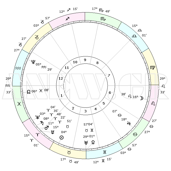 | | ΘΕΣΕΙΣ ΠΛΑΝΗΤΩΝ ΑΣΤΡΟΛΟΓΙΚΟΥ ΧΑΡΤΗ ΤΗΣ ΣΤΙΓΜΗΣ ΑΥΤΗΣ | | | | Πλανήτης | Ζώδιο | Μοίρες | Δεκαήμ. | Σε οίκο | Απόκλιση | | Ακμές των οίκων | | Ηλιος | Ταύρος | 04°48' | Πρώτο | 3 | 13 N 07 | | 1ος | 03°09' | Υδροχόος | | Σελήνη | Λέων | 15°54' | Δεύτερο | 7 | 17 N 51 | | 2ος | 17°45' | Ιχθείς | | Ερμής | Κριός | 15°17' | Δεύτερο | 2 | 03 N 46 | | 3ος | 25°40' | Κριός | | Αφροδίτη | Δίδυμοι | 01°00' | Πρώτο | 4 | 20 N 58 | | 4ος | 23°36' | Ταύρος | | Αρης | Κριός | 11°46' | Δεύτερο | 2 | 03 N 48 | | 5ος | 16°09' | Δίδυμοι | | Δίας | Καρκίνος | 18°07' | Δεύτερο | 6 | 22 N 35 | | 6ος | 07°41' | Καρκίνος | | Κρόνος | Κριός | 08°34' | Πρώτο | 2 | 01 N 25 | | 7ος | 03°09' | Λέων | | Ουρανός | Ταύρος | 29°57' | Τρίτο | 4 | 19 N 58 | | 8ος | 17°45' | Παρθένος | | Ποσειδώνας | Κριός | 03°04' | Πρώτο | 2 | 00 N 01 | | 9ος | 25°40' | Ζυγός | | Πλούτωνας | Υδροχόος | 05°29' | Πρώτο | 1 | 22 S 48 | | 10ος | 23°36' | Σκορπιός | | Β. Δεσμός | Ιχθείς | 06°08' | Πρώτο | 1 | 09 S 16 | | 11ος | 16°09' | Τοξότης | | Ωροσκόπος | Υδροχόος | 03°09' | Πρώτο | | | 12ος | 07°41' | Αιγόκερως | | Μεσουράνημα | Σκορπιός | 23°36' | Τρίτο | | | |