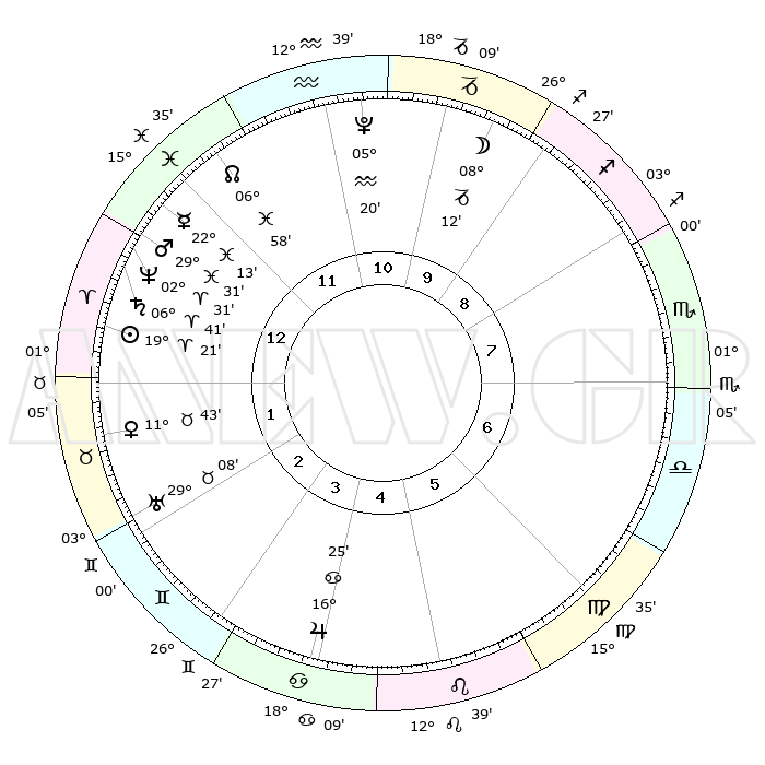 | | ΘΕΣΕΙΣ ΠΛΑΝΗΤΩΝ ΑΣΤΡΟΛΟΓΙΚΟΥ ΧΑΡΤΗ ΤΗΣ ΣΤΙΓΜΗΣ ΑΥΤΗΣ | | | | Πλανήτης | Ζώδιο | Μοίρες | Δεκαήμ. | Σε οίκο | Απόκλιση | | Ακμές των οίκων | | Ηλιος | Κριός | 19°17' | Δεύτερο | 1 | 07 N 33 | | 1ος | 21°10' | Ιχθείς | | Σελήνη | Αιγόκερως | 07°22' | Πρώτο | 10 | 27 S 44 | | 2ος | 03°27' | Ταύρος | | Ερμής | Ιχθείς | 22°08' | Τρίτο | 1 | 05 S 12 | | 3ος | 02°16' | Δίδυμοι | | Αφροδίτη | Ταύρος | 11°38' | Δεύτερο | 2 | 15 N 14 | | 4ος | 25°02' | Δίδυμοι | | Αρης | Ιχθείς | 29°28' | Τρίτο | 1 | 01 S 08 | | 5ος | 17°00' | Καρκίνος | | Δίας | Καρκίνος | 16°24' | Δεύτερο | 4 | 22 N 48 | | 6ος | 13°07' | Λέων | | Κρόνος | Κριός | 06°40' | Πρώτο | 1 | 00 N 41 | | 7ος | 21°10' | Παρθένος | | Ουρανός | Ταύρος | 29°08' | Τρίτο | 2 | 19 N 48 | | 8ος | 03°27' | Σκορπιός | | Ποσειδώνας | Κριός | 02°31' | Πρώτο | 1 | 00 S 12 | | 9ος | 02°16' | Τοξότης | | Πλούτωνας | Υδροχόος | 05°20' | Πρώτο | 11 | 22 S 47 | | 10ος | 25°02' | Τοξότης | | Β. Δεσμός | Ιχθείς | 06°58' | Πρώτο | 12 | 08 S 57 | | 11ος | 17°00' | Αιγόκερως | | Ωροσκόπος | Ιχθείς | 21°10' | Τρίτο | | | 12ος | 13°07' | Υδροχόος | | Μεσουράνημα | Τοξότης | 25°02' | Τρίτο | | | |