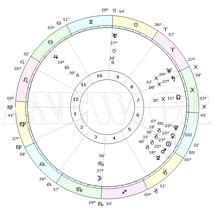 | | ΘΕΣΕΙΣ ΠΛΑΝΗΤΩΝ ΑΣΤΡΟΛΟΓΙΚΟΥ ΧΑΡΤΗ ΤΗΣ ΣΤΙΓΜΗΣ ΑΥΤΗΣ | | | | Πλανήτης | Ζώδιο | Μοίρες | Δεκαήμ. | Σε οίκο | Απόκλιση | | Ακμές των οίκων | | Ηλιος | Αιγόκερως | 23°31' | Τρίτο | 6 | 21 S 23 | | 1ος | 11°34' | Λέων | | Σελήνη | Σκορπιός | 26°42' | Τρίτο | 4 | 24 S 15 | | 2ος | 03°32' | Παρθένος | | Ερμής | Αιγόκερως | 18°33' | Δεύτερο | 6 | 23 S 50 | | 3ος | 00°08' | Ζυγός | | Αφροδίτη | Αιγόκερως | 25°12' | Τρίτο | 6 | 22 S 01 | | 4ος | 02°20' | Σκορπιός | | Αρης | Αιγόκερως | 22°29' | Τρίτο | 6 | 22 S 31 | | 5ος | 07°50' | Τοξότης | | Δίας | Καρκίνος | 19°39'R | Δεύτερο | 12 | 22 N 16 | | 6ος | 11°46' | Αιγόκερως | | Κρόνος | Ιχθείς | 27°09' | Τρίτο | 8 | 03 S 10 | | 7ος | 11°34' | Υδροχόος | | Ουρανός | Ταύρος | 27°39'R | Τρίτο | 10 | 19 N 27 | | 8ος | 03°32' | Ιχθείς | | Ποσειδώνας | Ιχθείς | 29°43' | Τρίτο | 8 | 01 S 20 | | 9ος | 00°08' | Κριός | | Πλούτωνας | Υδροχόος | 03°07' | Πρώτο | 6 | 23 S 08 | | 10ος | 02°20' | Ταύρος | | Β. Δεσμός | Ιχθείς | 11°30' | Δεύτερο | 8 | 07 S 15 | | 11ος | 07°50' | Δίδυμοι | | Ωροσκόπος | Λέων | 11°34' | Δεύτερο | | | 12ος | 11°46' | Καρκίνος | | Μεσουράνημα | Ταύρος | 02°20' | Πρώτο | | | |