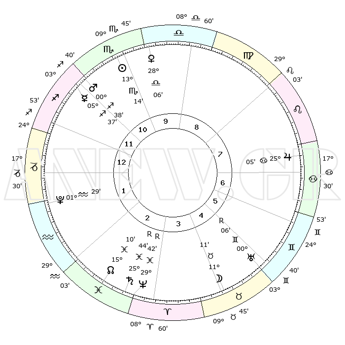 | | ΘΕΣΕΙΣ ΠΛΑΝΗΤΩΝ ΑΣΤΡΟΛΟΓΙΚΟΥ ΧΑΡΤΗ ΤΗΣ ΣΤΙΓΜΗΣ ΑΥΤΗΣ | | | | Πλανήτης | Ζώδιο | Μοίρες | Δεκαήμ. | Σε οίκο | Απόκλιση | | Ακμές των οίκων | | Ηλιος | Σκορπιός | 13°08' | Δεύτερο | 11 | 15 S 47 | | 1ος | 11°18' | Τοξότης | | Σελήνη | Ταύρος | 09°31' | Πρώτο | 5 | 18 N 29 | | 2ος | 14°16' | Αιγόκερως | | Ερμής | Τοξότης | 05°33' | Πρώτο | 12 | 23 S 59 | | 3ος | 21°52' | Υδροχόος | | Αφροδίτη | Ζυγός | 27°58' | Τρίτο | 11 | 09 S 26 | | 4ος | 27°49' | Ιχθείς | | Αρης | Τοξότης | 00°33' | Πρώτο | 12 | 20 S 41 | | 5ος | 27°13' | Κριός | | Δίας | Καρκίνος | 25°05' | Τρίτο | 8 | 21 N 12 | | 6ος | 20°48' | Ταύρος | | Κρόνος | Ιχθείς | 25°44'R | Τρίτο | 3 | 03 S 57 | | 7ος | 11°18' | Δίδυμοι | | Ουρανός | Δίδυμοι | 00°06'R | Πρώτο | 6 | 19 N 58 | | 8ος | 14°16' | Καρκίνος | | Ποσειδώνας | Ιχθείς | 29°42'R | Τρίτο | 4 | 01 S 22 | | 9ος | 21°52' | Λέων | | Πλούτωνας | Υδροχόος | 01°29' | Πρώτο | 2 | 23 S 30 | | 10ος | 27°49' | Παρθένος | | Β. Δεσμός | Ιχθείς | 15°10' | Δεύτερο | 3 | 05 S 50 | | 11ος | 27°13' | Ζυγός | | Ωροσκόπος | Τοξότης | 11°18' | Δεύτερο | | | 12ος | 20°48' | Σκορπιός | | Μεσουράνημα | Παρθένος | 27°49' | Τρίτο | | | |