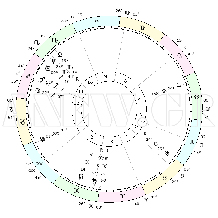 | | ΘΕΣΕΙΣ ΠΛΑΝΗΤΩΝ ΑΣΤΡΟΛΟΓΙΚΟΥ ΧΑΡΤΗ ΤΗΣ ΣΤΙΓΜΗΣ ΑΥΤΗΣ | | | | Πλανήτης | Ζώδιο | Μοίρες | Δεκαήμ. | Σε οίκο | Απόκλιση | | Ακμές των οίκων | | Ηλιος | Τοξότης | 00°13' | Πρώτο | 12 | 20 S 11 | | 1ος | 17°50' | Τοξότης | | Σελήνη | Τοξότης | 21°56' | Τρίτο | 1 | 28 S 09 | | 2ος | 22°06' | Αιγόκερως | | Ερμής | Σκορπιός | 25°48'R | Τρίτο | 11 | 18 S 05 | | 3ος | 00°45' | Ιχθείς | | Αφροδίτη | Σκορπιός | 19°15' | Δεύτερο | 11 | 16 S 34 | | 4ος | 06°14' | Κριός | | Αρης | Τοξότης | 12°52' | Δεύτερο | 12 | 22 S 55 | | 5ος | 04°34' | Ταύρος | | Δίας | Καρκίνος | 24°58'R | Τρίτο | 8 | 21 N 16 | | 6ος | 27°25' | Ταύρος | | Κρόνος | Ιχθείς | 25°19'R | Τρίτο | 3 | 04 S 04 | | 7ος | 17°50' | Δίδυμοι | | Ουρανός | Ταύρος | 29°24'R | Τρίτο | 6 | 19 N 49 | | 8ος | 22°06' | Καρκίνος | | Ποσειδώνας | Ιχθείς | 29°28'R | Τρίτο | 3 | 01 S 28 | | 9ος | 00°45' | Παρθένος | | Πλούτωνας | Υδροχόος | 01°44' | Πρώτο | 2 | 23 S 26 | | 10ος | 06°14' | Ζυγός | | Β. Δεσμός | Ιχθείς | 14°16' | Δεύτερο | 3 | 06 S 11 | | 11ος | 04°34' | Σκορπιός | | Ωροσκόπος | Τοξότης | 17°50' | Δεύτερο | | | 12ος | 27°25' | Σκορπιός | | Μεσουράνημα | Ζυγός | 06°14' | Πρώτο | | | |