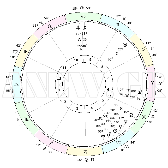 | | ΘΕΣΕΙΣ ΠΛΑΝΗΤΩΝ ΑΣΤΡΟΛΟΓΙΚΟΥ ΧΑΡΤΗ ΤΗΣ ΣΤΙΓΜΗΣ ΑΥΤΗΣ | | | | Πλανήτης | Ζώδιο | Μοίρες | Δεκαήμ. | Σε οίκο | Απόκλιση | | Ακμές των οίκων | | Ηλιος | Υδροχόος | 10°55' | Δεύτερο | 5 | 17 S 29 | | 1ος | 26°56' | Παρθένος | | Σελήνη | Καρκίνος | 12°45' | Δεύτερο | 10 | 27 N 09 | | 2ος | 23°18' | Ζυγός | | Ερμής | Υδροχόος | 17°24' | Δεύτερο | 5 | 17 S 28 | | 3ος | 23°37' | Σκορπιός | | Αφροδίτη | Υδροχόος | 16°42' | Δεύτερο | 5 | 17 S 06 | | 4ος | 26°34' | Τοξότης | | Αρης | Υδροχόος | 05°49' | Πρώτο | 5 | 19 S 49 | | 5ος | 29°35' | Αιγόκερως | | Δίας | Καρκίνος | 17°29'R | Δεύτερο | 10 | 22 N 35 | | 6ος | 00°08' | Ιχθείς | | Κρόνος | Ιχθείς | 28°38' | Τρίτο | 7 | 02 S 32 | | 7ος | 26°56' | Ιχθείς | | Ουρανός | Ταύρος | 27°28'R | Τρίτο | 9 | 19 N 24 | | 8ος | 23°18' | Κριός | | Ποσειδώνας | Κριός | 00°07' | Πρώτο | 7 | 01 S 10 | | 9ος | 23°37' | Ταύρος | | Πλούτωνας | Υδροχόος | 03°40' | Πρώτο | 5 | 23 S 02 | | 10ος | 26°34' | Δίδυμοι | | Β. Δεσμός | Ιχθείς | 10°35' | Δεύτερο | 6 | 07 S 36 | | 11ος | 29°35' | Καρκίνος | | Ωροσκόπος | Παρθένος | 26°56' | Τρίτο | | | 12ος | 00°08' | Παρθένος | | Μεσουράνημα | Δίδυμοι | 26°34' | Τρίτο | | | |