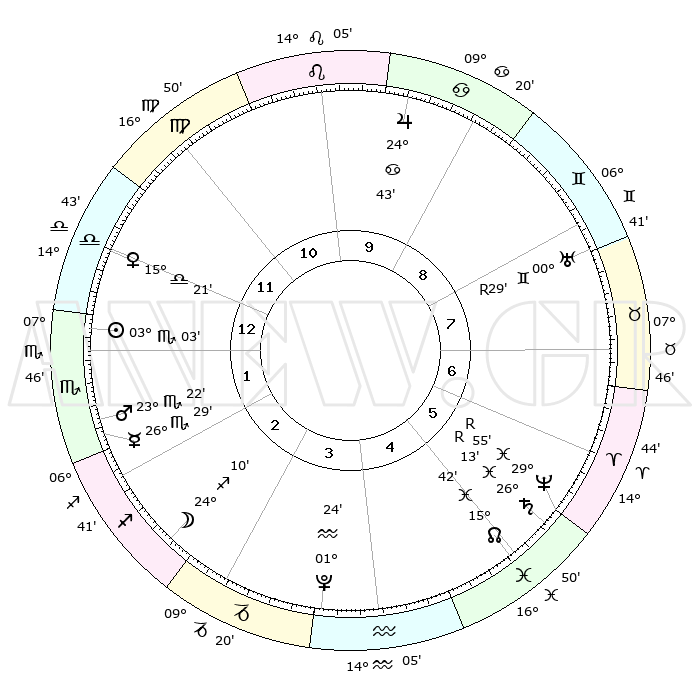| | ΘΕΣΕΙΣ ΠΛΑΝΗΤΩΝ ΑΣΤΡΟΛΟΓΙΚΟΥ ΧΑΡΤΗ ΤΗΣ ΣΤΙΓΜΗΣ ΑΥΤΗΣ | | | | Πλανήτης | Ζώδιο | Μοίρες | Δεκαήμ. | Σε οίκο | Απόκλιση | | Ακμές των οίκων | | Ηλιος | Σκορπιός | 02°37' | Πρώτο | 5 | 12 S 23 | | 1ος | 02°50' | Καρκίνος | | Σελήνη | Τοξότης | 19°08' | Δεύτερο | 6 | 28 S 06 | | 2ος | 23°28' | Καρκίνος | | Ερμής | Σκορπιός | 25°60' | Τρίτο | 5 | 21 S 51 | | 3ος | 15°28' | Λέων | | Αφροδίτη | Ζυγός | 14°49' | Δεύτερο | 4 | 04 S 26 | | 4ος | 12°15' | Παρθένος | | Αρης | Σκορπιός | 23°04' | Τρίτο | 5 | 18 S 51 | | 5ος | 16°37' | Ζυγός | | Δίας | Καρκίνος | 24°41' | Τρίτο | 2 | 21 N 15 | | 6ος | 26°23' | Σκορπιός | | Κρόνος | Ιχθείς | 26°14'R | Τρίτο | 10 | 03 S 46 | | 7ος | 02°50' | Αιγόκερως | | Ουρανός | Δίδυμοι | 00°30'R | Πρώτο | 12 | 20 N 03 | | 8ος | 23°28' | Αιγόκερως | | Ποσειδώνας | Ιχθείς | 29°55'R | Τρίτο | 10 | 01 S 17 | | 9ος | 15°28' | Υδροχόος | | Πλούτωνας | Υδροχόος | 01°24' | Πρώτο | 8 | 23 S 32 | | 10ος | 12°15' | Ιχθείς | | Β. Δεσμός | Ιχθείς | 15°44' | Δεύτερο | 10 | 05 S 38 | | 11ος | 16°37' | Κριός | | Ωροσκόπος | Καρκίνος | 02°50' | Πρώτο | | | 12ος | 26°23' | Ταύρος | | Μεσουράνημα | Ιχθείς | 12°15' | Δεύτερο | | | |