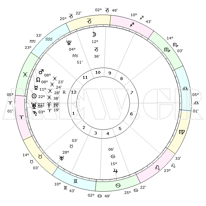| | ΘΕΣΕΙΣ ΠΛΑΝΗΤΩΝ ΑΣΤΡΟΛΟΓΙΚΟΥ ΧΑΡΤΗ ΤΗΣ ΣΤΙΓΜΗΣ ΑΥΤΗΣ | | | | Πλανήτης | Ζώδιο | Μοίρες | Δεκαήμ. | Σε οίκο | Απόκλιση | | Ακμές των οίκων | | Ηλιος | Ιχθείς | 22°35' | Τρίτο | 1 | 02 S 57 | | 1ος | 00°39' | Ιχθείς | | Σελήνη | Αιγόκερως | 11°52' | Δεύτερο | 11 | 27 S 19 | | 2ος | 16°01' | Κριός | | Ερμής | Ιχθείς | 11°30'R | Δεύτερο | 1 | 04 S 38 | | 3ος | 18°36' | Ταύρος | | Αφροδίτη | Κριός | 08°21' | Πρώτο | 1 | 02 N 18 | | 4ος | 12°57' | Δίδυμοι | | Αρης | Ιχθείς | 08°20' | Πρώτο | 1 | 09 S 27 | | 5ος | 04°38' | Καρκίνος | | Δίας | Καρκίνος | 15°06' | Δεύτερο | 5 | 22 N 56 | | 6ος | 28°15' | Καρκίνος | | Κρόνος | Κριός | 03°19' | Πρώτο | 1 | 00 S 38 | | 7ος | 00°39' | Παρθένος | | Ουρανός | Ταύρος | 28°03' | Τρίτο | 3 | 19 N 33 | | 8ος | 16°01' | Ζυγός | | Ποσειδώνας | Κριός | 01°30' | Πρώτο | 1 | 00 S 36 | | 9ος | 18°36' | Σκορπιός | | Πλούτωνας | Υδροχόος | 04°51' | Πρώτο | 12 | 22 S 50 | | 10ος | 12°57' | Τοξότης | | Β. Δεσμός | Ιχθείς | 08°24' | Πρώτο | 1 | 08 S 25 | | 11ος | 04°38' | Αιγόκερως | | Ωροσκόπος | Ιχθείς | 00°39' | Πρώτο | | | 12ος | 28°15' | Αιγόκερως | | Μεσουράνημα | Τοξότης | 12°57' | Δεύτερο | | | |