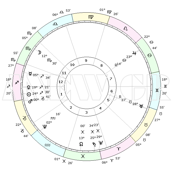 | | ΘΕΣΕΙΣ ΠΛΑΝΗΤΩΝ ΑΣΤΡΟΛΟΓΙΚΟΥ ΧΑΡΤΗ ΤΗΣ ΣΤΙΓΜΗΣ ΑΥΤΗΣ | | | | Πλανήτης | Ζώδιο | Μοίρες | Δεκαήμ. | Σε οίκο | Απόκλιση | | Ακμές των οίκων | | Ηλιος | Τοξότης | 24°06' | Τρίτο | 4 | 23 S 18 | | 1ος | 27°15' | Λέων | | Σελήνη | Σκορπιός | 08°01' | Πρώτο | 3 | 18 S 04 | | 2ος | 20°49' | Παρθένος | | Ερμής | Τοξότης | 05°03' | Πρώτο | 4 | 19 S 44 | | 3ος | 19°14' | Ζυγός | | Αφροδίτη | Τοξότης | 18°52' | Δεύτερο | 4 | 22 S 50 | | 4ος | 22°06' | Σκορπιός | | Αρης | Αιγόκερως | 00°24' | Πρώτο | 5 | 24 S 13 | | 5ος | 26°29' | Τοξότης | | Δίας | Καρκίνος | 23°17'R | Τρίτο | 11 | 21 N 37 | | 6ος | 28°40' | Αιγόκερως | | Κρόνος | Ιχθείς | 25°33' | Τρίτο | 8 | 03 S 53 | | 7ος | 27°15' | Υδροχόος | | Ουρανός | Ταύρος | 28°28'R | Τρίτο | 10 | 19 N 37 | | 8ος | 20°49' | Ιχθείς | | Ποσειδώνας | Ιχθείς | 29°23' | Τρίτο | 8 | 01 S 29 | | 9ος | 19°14' | Κριός | | Πλούτωνας | Υδροχόος | 02°16' | Πρώτο | 6 | 23 S 19 | | 10ος | 22°06' | Ταύρος | | Β. Δεσμός | Ιχθείς | 13°01' | Δεύτερο | 7 | 06 S 40 | | 11ος | 26°29' | Δίδυμοι | | Ωροσκόπος | Λέων | 27°15' | Τρίτο | | | 12ος | 28°40' | Καρκίνος | | Μεσουράνημα | Ταύρος | 22°06' | Τρίτο | | | |