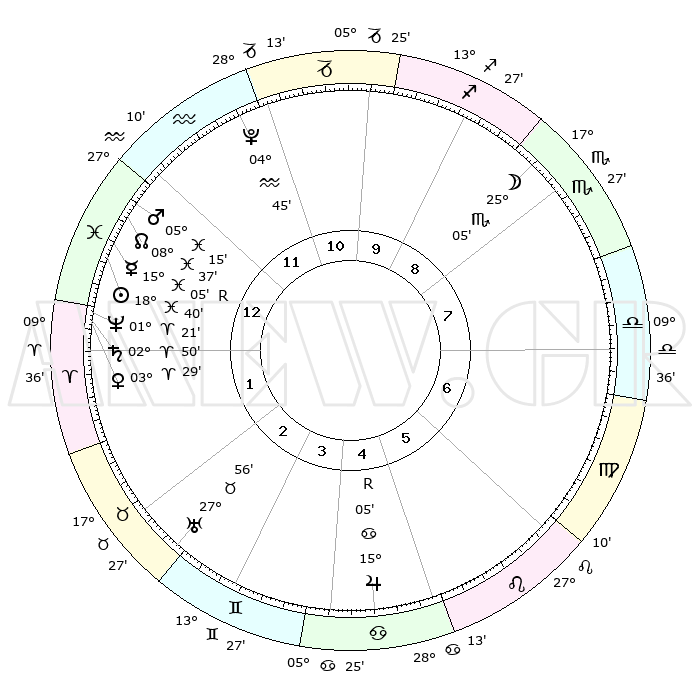 | | ΘΕΣΕΙΣ ΠΛΑΝΗΤΩΝ ΑΣΤΡΟΛΟΓΙΚΟΥ ΧΑΡΤΗ ΤΗΣ ΣΤΙΓΜΗΣ ΑΥΤΗΣ | | | | Πλανήτης | Ζώδιο | Μοίρες | Δεκαήμ. | Σε οίκο | Απόκλιση | | Ακμές των οίκων | | Ηλιος | Ιχθείς | 18°32' | Δεύτερο | 2 | 04 S 32 | | 1ος | 02°37' | Υδροχόος | | Σελήνη | Σκορπιός | 23°35' | Τρίτο | 10 | 23 S 35 | | 2ος | 17°07' | Ιχθείς | | Ερμής | Ιχθείς | 15°12'R | Δεύτερο | 1 | 02 S 36 | | 3ος | 25°09' | Κριός | | Αφροδίτη | Κριός | 03°19' | Πρώτο | 2 | 00 N 13 | | 4ος | 23°10' | Ταύρος | | Αρης | Ιχθείς | 05°09' | Πρώτο | 1 | 10 S 38 | | 5ος | 15°45' | Δίδυμοι | | Δίας | Καρκίνος | 15°06'R | Δεύτερο | 6 | 22 N 56 | | 6ος | 07°16' | Καρκίνος | | Κρόνος | Κριός | 02°49' | Πρώτο | 2 | 00 S 50 | | 7ος | 02°37' | Λέων | | Ουρανός | Ταύρος | 27°56' | Τρίτο | 4 | 19 N 31 | | 8ος | 17°07' | Παρθένος | | Ποσειδώνας | Κριός | 01°21' | Πρώτο | 2 | 00 S 40 | | 9ος | 25°09' | Ζυγός | | Πλούτωνας | Υδροχόος | 04°45' | Πρώτο | 1 | 22 S 51 | | 10ος | 23°10' | Σκορπιός | | Β. Δεσμός | Ιχθείς | 08°37' | Πρώτο | 1 | 08 S 20 | | 11ος | 15°45' | Τοξότης | | Ωροσκόπος | Υδροχόος | 02°37' | Πρώτο | | | 12ος | 07°16' | Αιγόκερως | | Μεσουράνημα | Σκορπιός | 23°10' | Τρίτο | | | |