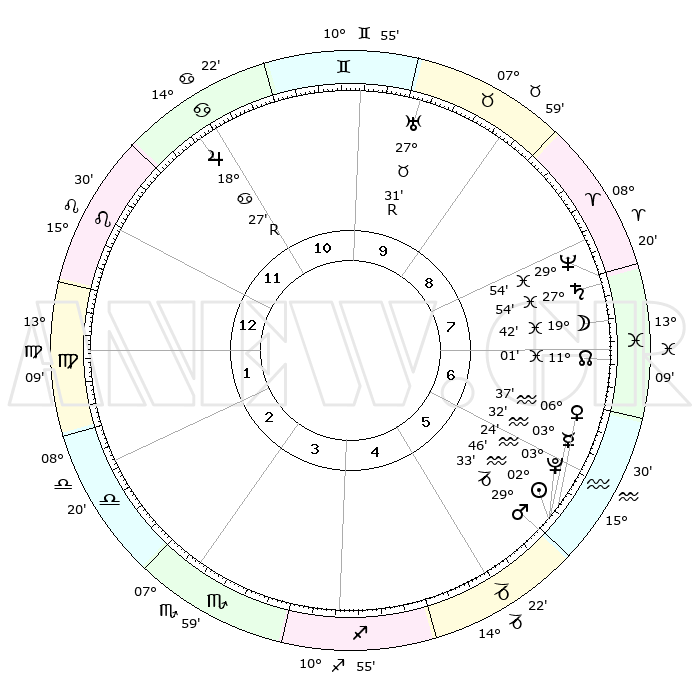 | | ΘΕΣΕΙΣ ΠΛΑΝΗΤΩΝ ΑΣΤΡΟΛΟΓΙΚΟΥ ΧΑΡΤΗ ΤΗΣ ΣΤΙΓΜΗΣ ΑΥΤΗΣ | | | | Πλανήτης | Ζώδιο | Μοίρες | Δεκαήμ. | Σε οίκο | Απόκλιση | | Ακμές των οίκων | | Ηλιος | Υδροχόος | 02°42' | Πρώτο | 6 | 19 S 33 | | 1ος | 22°18' | Λέων | | Σελήνη | Ιχθείς | 18°45' | Δεύτερο | 8 | 03 S 40 | | 2ος | 15°20' | Παρθένος | | Ερμής | Υδροχόος | 03°25' | Πρώτο | 6 | 21 S 24 | | 3ος | 13°14' | Ζυγός | | Αφροδίτη | Υδροχόος | 06°32' | Πρώτο | 6 | 19 S 47 | | 4ος | 15°60' | Σκορπιός | | Αρης | Αιγόκερως | 29°29' | Τρίτο | 6 | 21 S 14 | | 5ος | 20°44' | Τοξότης | | Δίας | Καρκίνος | 18°28'R | Δεύτερο | 11 | 22 N 27 | | 6ος | 23°23' | Αιγόκερως | | Κρόνος | Ιχθείς | 27°53' | Τρίτο | 8 | 02 S 51 | | 7ος | 22°18' | Υδροχόος | | Ουρανός | Ταύρος | 27°31'R | Τρίτο | 10 | 19 N 25 | | 8ος | 15°20' | Ιχθείς | | Ποσειδώνας | Ιχθείς | 29°54' | Τρίτο | 8 | 01 S 15 | | 9ος | 13°14' | Κριός | | Πλούτωνας | Υδροχόος | 03°24' | Πρώτο | 6 | 23 S 05 | | 10ος | 15°60' | Ταύρος | | Β. Δεσμός | Ιχθείς | 11°01' | Δεύτερο | 7 | 07 S 26 | | 11ος | 20°44' | Δίδυμοι | | Ωροσκόπος | Λέων | 22°18' | Τρίτο | | | 12ος | 23°23' | Καρκίνος | | Μεσουράνημα | Ταύρος | 15°60' | Δεύτερο | | | |