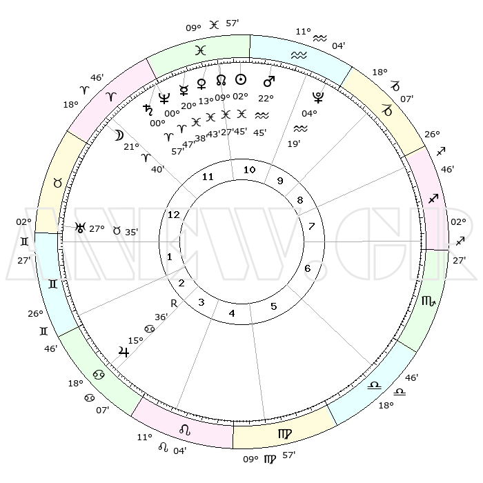 | | ΘΕΣΕΙΣ ΠΛΑΝΗΤΩΝ ΑΣΤΡΟΛΟΓΙΚΟΥ ΧΑΡΤΗ ΤΗΣ ΣΤΙΓΜΗΣ ΑΥΤΗΣ | | | | Πλανήτης | Ζώδιο | Μοίρες | Δεκαήμ. | Σε οίκο | Απόκλιση | | Ακμές των οίκων | | Ηλιος | Ιχθείς | 02°41' | Πρώτο | 11 | 10 S 31 | | 1ος | 28°32' | Κριός | | Σελήνη | Κριός | 20°41' | Τρίτο | 12 | 11 N 20 | | 2ος | 01°10' | Δίδυμοι | | Ερμής | Ιχθείς | 20°35' | Τρίτο | 12 | 02 S 16 | | 3ος | 24°52' | Δίδυμοι | | Αφροδίτη | Ιχθείς | 13°38' | Δεύτερο | 12 | 07 S 46 | | 4ος | 16°33' | Καρκίνος | | Αρης | Υδροχόος | 22°42' | Τρίτο | 11 | 14 S 59 | | 5ος | 10°49' | Λέων | | Δίας | Καρκίνος | 15°36'R | Δεύτερο | 3 | 22 N 51 | | 6ος | 13°14' | Παρθένος | | Κρόνος | Κριός | 00°56' | Πρώτο | 12 | 01 S 35 | | 7ος | 28°32' | Ζυγός | | Ουρανός | Ταύρος | 27°35' | Τρίτο | 1 | 19 N 26 | | 8ος | 01°10' | Τοξότης | | Ποσειδώνας | Κριός | 00°47' | Πρώτο | 12 | 00 S 53 | | 9ος | 24°52' | Τοξότης | | Πλούτωνας | Υδροχόος | 04°19' | Πρώτο | 10 | 22 S 55 | | 10ος | 16°33' | Αιγόκερως | | Β. Δεσμός | Ιχθείς | 09°27' | Πρώτο | 11 | 08 S 01 | | 11ος | 10°49' | Υδροχόος | | Ωροσκόπος | Κριός | 28°32' | Τρίτο | | | 12ος | 13°14' | Ιχθείς | | Μεσουράνημα | Αιγόκερως | 16°33' | Δεύτερο | | | |