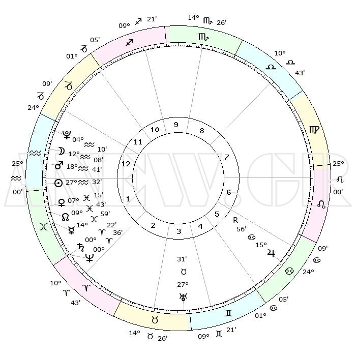 | | ΘΕΣΕΙΣ ΠΛΑΝΗΤΩΝ ΑΣΤΡΟΛΟΓΙΚΟΥ ΧΑΡΤΗ ΤΗΣ ΣΤΙΓΜΗΣ ΑΥΤΗΣ | | | | Πλανήτης | Ζώδιο | Μοίρες | Δεκαήμ. | Σε οίκο | Απόκλιση | | Ακμές των οίκων | | Ηλιος | Υδροχόος | 27°28' | Τρίτο | 1 | 12 S 21 | | 1ος | 23°10' | Αιγόκερως | | Σελήνη | Υδροχόος | 11°14' | Δεύτερο | 1 | 19 S 46 | | 2ος | 05°60' | Ιχθείς | | Ερμής | Ιχθείς | 14°54' | Δεύτερο | 2 | 05 S 40 | | 3ος | 15°23' | Κριός | | Αφροδίτη | Ιχθείς | 07°10' | Πρώτο | 2 | 10 S 14 | | 4ος | 15°04' | Ταύρος | | Αρης | Υδροχόος | 18°38' | Δεύτερο | 1 | 16 S 16 | | 5ος | 08°24' | Δίδυμοι | | Δίας | Καρκίνος | 15°56'R | Δεύτερο | 6 | 22 N 48 | | 6ος | 29°39' | Δίδυμοι | | Κρόνος | Κριός | 00°21' | Πρώτο | 2 | 01 S 50 | | 7ος | 23°10' | Καρκίνος | | Ουρανός | Ταύρος | 27°31' | Τρίτο | 4 | 19 N 25 | | 8ος | 05°60' | Παρθένος | | Ποσειδώνας | Κριός | 00°36' | Πρώτο | 2 | 00 S 58 | | 9ος | 15°23' | Ζυγός | | Πλούτωνας | Υδροχόος | 04°10' | Πρώτο | 1 | 22 S 56 | | 10ος | 15°04' | Σκορπιός | | Β. Δεσμός | Ιχθείς | 09°44' | Πρώτο | 2 | 07 S 55 | | 11ος | 08°24' | Τοξότης | | Ωροσκόπος | Αιγόκερως | 23°10' | Τρίτο | | | 12ος | 29°39' | Τοξότης | | Μεσουράνημα | Σκορπιός | 15°04' | Δεύτερο | | | |