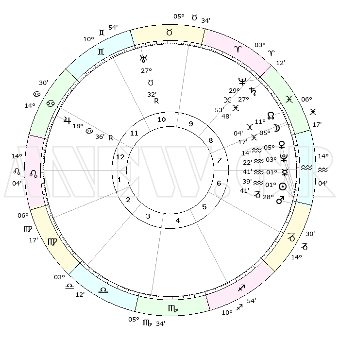 | | ΘΕΣΕΙΣ ΠΛΑΝΗΤΩΝ ΑΣΤΡΟΛΟΓΙΚΟΥ ΧΑΡΤΗ ΤΗΣ ΣΤΙΓΜΗΣ ΑΥΤΗΣ | | | | Πλανήτης | Ζώδιο | Μοίρες | Δεκαήμ. | Σε οίκο | Απόκλιση | | Ακμές των οίκων | | Ηλιος | Υδροχόος | 01°34' | Πρώτο | 7 | 19 S 48 | | 1ος | 20°30' | Καρκίνος | | Σελήνη | Ιχθείς | 04°14' | Πρώτο | 8 | 10 S 23 | | 2ος | 11°04' | Λέων | | Ερμής | Υδροχόος | 01°33' | Πρώτο | 7 | 21 S 49 | | 3ος | 04°52' | Παρθένος | | Αφροδίτη | Υδροχόος | 05°08' | Πρώτο | 7 | 20 S 06 | | 4ος | 04°34' | Ζυγός | | Αρης | Αιγόκερως | 28°38' | Τρίτο | 7 | 21 S 25 | | 5ος | 10°34' | Σκορπιός | | Δίας | Καρκίνος | 18°37'R | Δεύτερο | 12 | 22 N 25 | | 6ος | 17°53' | Τοξότης | | Κρόνος | Ιχθείς | 27°48' | Τρίτο | 9 | 02 S 54 | | 7ος | 20°30' | Αιγόκερως | | Ουρανός | Ταύρος | 27°32'R | Τρίτο | 11 | 19 N 25 | | 8ος | 11°04' | Υδροχόος | | Ποσειδώνας | Ιχθείς | 29°53' | Τρίτο | 9 | 01 S 16 | | 9ος | 04°52' | Ιχθείς | | Πλούτωνας | Υδροχόος | 03°22' | Πρώτο | 7 | 23 S 05 | | 10ος | 04°34' | Κριός | | Β. Δεσμός | Ιχθείς | 11°05' | Δεύτερο | 9 | 07 S 25 | | 11ος | 10°34' | Ταύρος | | Ωροσκόπος | Καρκίνος | 20°30' | Τρίτο | | | 12ος | 17°53' | Δίδυμοι | | Μεσουράνημα | Κριός | 04°34' | Πρώτο | | | |