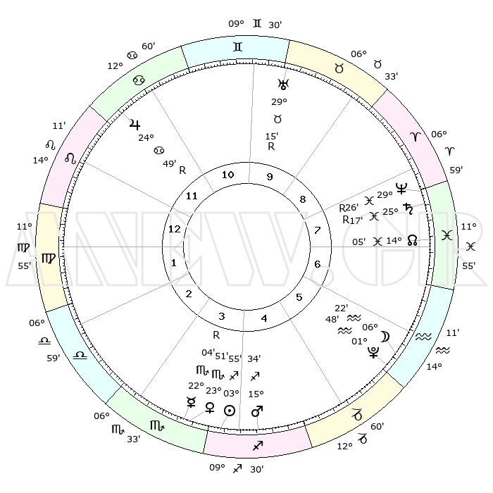 | | ΘΕΣΕΙΣ ΠΛΑΝΗΤΩΝ ΑΣΤΡΟΛΟΓΙΚΟΥ ΧΑΡΤΗ ΤΗΣ ΣΤΙΓΜΗΣ ΑΥΤΗΣ | | | | Πλανήτης | Ζώδιο | Μοίρες | Δεκαήμ. | Σε οίκο | Απόκλιση | | Ακμές των οίκων | | Ηλιος | Τοξότης | 03°50' | Πρώτο | 4 | 20 S 55 | | 1ος | 16°51' | Λέων | | Σελήνη | Υδροχόος | 05°18' | Πρώτο | 6 | 22 S 01 | | 2ος | 09°21' | Παρθένος | | Ερμής | Σκορπιός | 22°07'R | Τρίτο | 4 | 16 S 18 | | 3ος | 06°37' | Ζυγός | | Αφροδίτη | Σκορπιός | 23°45' | Τρίτο | 4 | 17 S 51 | | 4ος | 09°08' | Σκορπιός | | Αρης | Τοξότης | 15°30' | Δεύτερο | 5 | 23 S 16 | | 5ος | 14°17' | Τοξότης | | Δίας | Καρκίνος | 24°49'R | Τρίτο | 12 | 21 N 18 | | 6ος | 17°32' | Αιγόκερως | | Κρόνος | Ιχθείς | 25°17'R | Τρίτο | 8 | 04 S 04 | | 7ος | 16°51' | Υδροχόος | | Ουρανός | Ταύρος | 29°15'R | Τρίτο | 10 | 19 N 47 | | 8ος | 09°21' | Ιχθείς | | Ποσειδώνας | Ιχθείς | 29°26'R | Τρίτο | 8 | 01 S 28 | | 9ος | 06°37' | Κριός | | Πλούτωνας | Υδροχόος | 01°48' | Πρώτο | 6 | 23 S 25 | | 10ος | 09°08' | Ταύρος | | Β. Δεσμός | Ιχθείς | 14°05' | Δεύτερο | 8 | 06 S 16 | | 11ος | 14°17' | Δίδυμοι | | Ωροσκόπος | Λέων | 16°51' | Δεύτερο | | | 12ος | 17°32' | Καρκίνος | | Μεσουράνημα | Ταύρος | 09°08' | Πρώτο | | | |