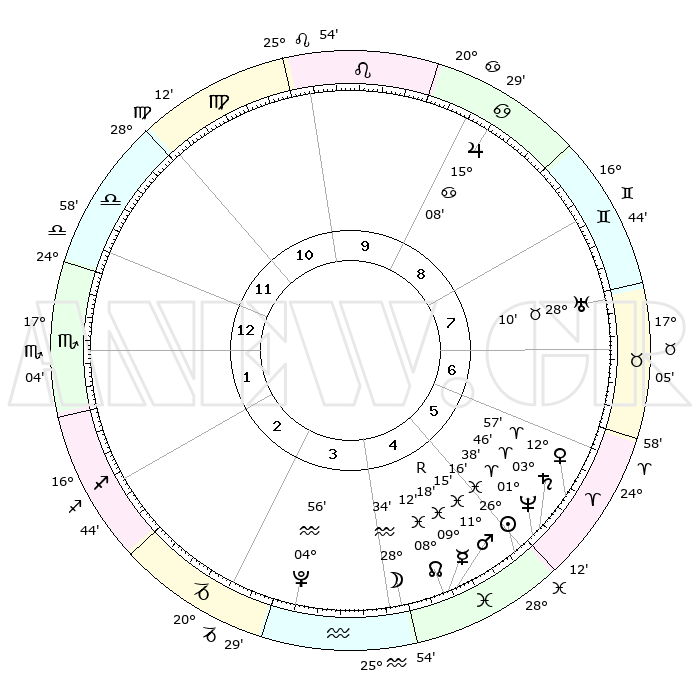 | | ΘΕΣΕΙΣ ΠΛΑΝΗΤΩΝ ΑΣΤΡΟΛΟΓΙΚΟΥ ΧΑΡΤΗ ΤΗΣ ΣΤΙΓΜΗΣ ΑΥΤΗΣ | | | | Πλανήτης | Ζώδιο | Μοίρες | Δεκαήμ. | Σε οίκο | Απόκλιση | | Ακμές των οίκων | | Ηλιος | Ιχθείς | 26°13' | Τρίτο | 5 | 01 S 30 | | 1ος | 00°34' | Σκορπιός | | Σελήνη | Υδροχόος | 27°49' | Τρίτο | 4 | 13 S 11 | | 2ος | 29°01' | Σκορπιός | | Ερμής | Ιχθείς | 09°19'R | Πρώτο | 5 | 06 S 14 | | 3ος | 01°01' | Αιγόκερως | | Αφροδίτη | Κριός | 12°52' | Δεύτερο | 6 | 04 N 10 | | 4ος | 05°15' | Υδροχόος | | Αρης | Ιχθείς | 11°12' | Δεύτερο | 5 | 08 S 22 | | 5ος | 08°09' | Ιχθείς | | Δίας | Καρκίνος | 15°08' | Δεύτερο | 9 | 22 N 56 | | 6ος | 06°47' | Κριός | | Κρόνος | Κριός | 03°46' | Πρώτο | 5 | 00 S 27 | | 7ος | 00°34' | Ταύρος | | Ουρανός | Ταύρος | 28°10' | Τρίτο | 7 | 19 N 35 | | 8ος | 29°01' | Ταύρος | | Ποσειδώνας | Κριός | 01°38' | Πρώτο | 5 | 00 S 33 | | 9ος | 01°01' | Καρκίνος | | Πλούτωνας | Υδροχόος | 04°56' | Πρώτο | 3 | 22 S 49 | | 10ος | 05°15' | Λέων | | Β. Δεσμός | Ιχθείς | 08°12' | Πρώτο | 5 | 08 S 29 | | 11ος | 08°09' | Παρθένος | | Ωροσκόπος | Σκορπιός | 00°34' | Πρώτο | | | 12ος | 06°47' | Ζυγός | | Μεσουράνημα | Λέων | 05°15' | Πρώτο | | | |