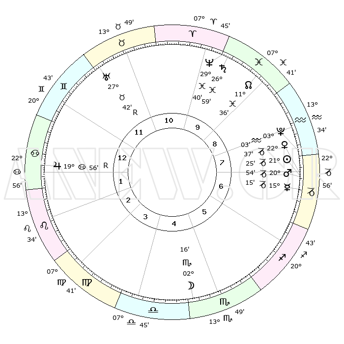 | | ΘΕΣΕΙΣ ΠΛΑΝΗΤΩΝ ΑΣΤΡΟΛΟΓΙΚΟΥ ΧΑΡΤΗ ΤΗΣ ΣΤΙΓΜΗΣ ΑΥΤΗΣ | | | | Πλανήτης | Ζώδιο | Μοίρες | Δεκαήμ. | Σε οίκο | Απόκλιση | | Ακμές των οίκων | | Ηλιος | Αιγόκερως | 21°05' | Τρίτο | 11 | 21 S 47 | | 1ος | 23°22' | Υδροχόος | | Σελήνη | Ζυγός | 28°17' | Τρίτο | 8 | 14 S 25 | | 2ος | 09°08' | Κριός | | Ερμής | Αιγόκερως | 14°43' | Δεύτερο | 11 | 24 S 09 | | 3ος | 13°11' | Ταύρος | | Αφροδίτη | Αιγόκερως | 22°11' | Τρίτο | 11 | 22 S 28 | | 4ος | 08°17' | Δίδυμοι | | Αρης | Αιγόκερως | 20°38' | Τρίτο | 11 | 22 S 47 | | 5ος | 00°02' | Καρκίνος | | Δίας | Καρκίνος | 19°58'R | Δεύτερο | 5 | 22 N 12 | | 6ος | 22°57' | Καρκίνος | | Κρόνος | Ιχθείς | 26°58' | Τρίτο | 1 | 03 S 15 | | 7ος | 23°22' | Λέων | | Ουρανός | Ταύρος | 27°42'R | Τρίτο | 3 | 19 N 27 | | 8ος | 09°08' | Ζυγός | | Ποσειδώνας | Ιχθείς | 29°40' | Τρίτο | 1 | 01 S 21 | | 9ος | 13°11' | Σκορπιός | | Πλούτωνας | Υδροχόος | 03°02' | Πρώτο | 12 | 23 S 09 | | 10ος | 08°17' | Τοξότης | | Β. Δεσμός | Ιχθείς | 11°37' | Δεύτερο | 1 | 07 S 12 | | 11ος | 00°02' | Αιγόκερως | | Ωροσκόπος | Υδροχόος | 23°22' | Τρίτο | | | 12ος | 22°57' | Αιγόκερως | | Μεσουράνημα | Τοξότης | 08°17' | Πρώτο | | | |