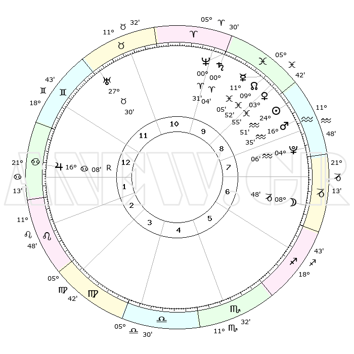 | | ΘΕΣΕΙΣ ΠΛΑΝΗΤΩΝ ΑΣΤΡΟΛΟΓΙΚΟΥ ΧΑΡΤΗ ΤΗΣ ΣΤΙΓΜΗΣ ΑΥΤΗΣ | | | | Πλανήτης | Ζώδιο | Μοίρες | Δεκαήμ. | Σε οίκο | Απόκλιση | | Ακμές των οίκων | | Ηλιος | Υδροχόος | 24°46' | Τρίτο | 9 | 13 S 16 | | 1ος | 00°26' | Καρκίνος | | Σελήνη | Αιγόκερως | 07°60' | Πρώτο | 7 | 27 S 47 | | 2ος | 21°12' | Καρκίνος | | Ερμής | Ιχθείς | 10°59' | Δεύτερο | 10 | 07 S 42 | | 3ος | 13°01' | Λέων | | Αφροδίτη | Ιχθείς | 03°50' | Πρώτο | 9 | 11 S 28 | | 4ος | 09°25' | Παρθένος | | Αρης | Υδροχόος | 16°32' | Δεύτερο | 9 | 16 S 54 | | 5ος | 13°25' | Ζυγός | | Δίας | Καρκίνος | 16°09'R | Δεύτερο | 1 | 22 N 47 | | 6ος | 23°23' | Σκορπιός | | Κρόνος | Κριός | 00°03' | Πρώτο | 10 | 01 S 57 | | 7ος | 00°26' | Αιγόκερως | | Ουρανός | Ταύρος | 27°30' | Τρίτο | 12 | 19 N 25 | | 8ος | 21°12' | Αιγόκερως | | Ποσειδώνας | Κριός | 00°31' | Πρώτο | 10 | 01 S 00 | | 9ος | 13°01' | Υδροχόος | | Πλούτωνας | Υδροχόος | 04°05' | Πρώτο | 8 | 22 S 57 | | 10ος | 09°25' | Ιχθείς | | Β. Δεσμός | Ιχθείς | 09°52' | Πρώτο | 10 | 07 S 52 | | 11ος | 13°25' | Κριός | | Ωροσκόπος | Καρκίνος | 00°26' | Πρώτο | | | 12ος | 23°23' | Ταύρος | | Μεσουράνημα | Ιχθείς | 09°25' | Πρώτο | | | |