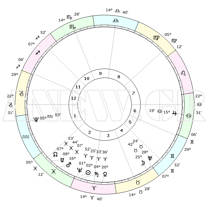 | | ΘΕΣΕΙΣ ΠΛΑΝΗΤΩΝ ΑΣΤΡΟΛΟΓΙΚΟΥ ΧΑΡΤΗ ΤΗΣ ΣΤΙΓΜΗΣ ΑΥΤΗΣ | | | | Πλανήτης | Ζώδιο | Μοίρες | Δεκαήμ. | Σε οίκο | Απόκλιση | | Ακμές των οίκων | | Ηλιος | Κριός | 02°20' | Πρώτο | 3 | 00 N 56 | | 1ος | 23°26' | Τοξότης | | Σελήνη | Ταύρος | 24°30' | Τρίτο | 5 | 23 N 48 | | 2ος | 28°59' | Αιγόκερως | | Ερμής | Ιχθείς | 08°43' | Πρώτο | 3 | 07 S 52 | | 3ος | 08°21' | Ιχθείς | | Αφροδίτη | Κριός | 20°30' | Τρίτο | 4 | 07 N 17 | | 4ος | 13°14' | Κριός | | Αρης | Ιχθείς | 16°03' | Δεύτερο | 3 | 06 S 29 | | 5ος | 10°38' | Ταύρος | | Δίας | Καρκίνος | 15°19' | Δεύτερο | 7 | 22 N 55 | | 6ος | 02°56' | Δίδυμοι | | Κρόνος | Κριός | 04°32' | Πρώτο | 3 | 00 S 09 | | 7ος | 23°26' | Δίδυμοι | | Ουρανός | Ταύρος | 28°24' | Τρίτο | 5 | 19 N 38 | | 8ος | 28°59' | Καρκίνος | | Ποσειδώνας | Κριός | 01°52' | Πρώτο | 3 | 00 S 27 | | 9ος | 08°21' | Παρθένος | | Πλούτωνας | Υδροχόος | 05°03' | Πρώτο | 2 | 22 S 48 | | 10ος | 13°14' | Ζυγός | | Β. Δεσμός | Ιχθείς | 07°53' | Πρώτο | 2 | 08 S 37 | | 11ος | 10°38' | Σκορπιός | | Ωροσκόπος | Τοξότης | 23°26' | Τρίτο | | | 12ος | 02°56' | Τοξότης | | Μεσουράνημα | Ζυγός | 13°14' | Δεύτερο | | | |