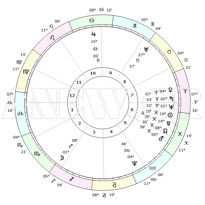 | | ΘΕΣΕΙΣ ΠΛΑΝΗΤΩΝ ΑΣΤΡΟΛΟΓΙΚΟΥ ΧΑΡΤΗ ΤΗΣ ΣΤΙΓΜΗΣ ΑΥΤΗΣ | | | | Πλανήτης | Ζώδιο | Μοίρες | Δεκαήμ. | Σε οίκο | Απόκλιση | | Ακμές των οίκων | | Ηλιος | Ιχθείς | 19°07' | Δεύτερο | 6 | 04 S 18 | | 1ος | 22°43' | Παρθένος | | Σελήνη | Τοξότης | 00°32' | Πρώτο | 3 | 25 S 21 | | 2ος | 18°45' | Ζυγός | | Ερμής | Ιχθείς | 14°38'R | Δεύτερο | 6 | 02 S 53 | | 3ος | 18°53' | Σκορπιός | | Αφροδίτη | Κριός | 04°03' | Πρώτο | 7 | 00 N 31 | | 4ος | 21°49' | Τοξότης | | Αρης | Ιχθείς | 05°36' | Πρώτο | 6 | 10 S 28 | | 5ος | 24°56' | Αιγόκερως | | Δίας | Καρκίνος | 15°05'R | Δεύτερο | 10 | 22 N 56 | | 6ος | 25°38' | Υδροχόος | | Κρόνος | Κριός | 02°53' | Πρώτο | 7 | 00 S 48 | | 7ος | 22°43' | Ιχθείς | | Ουρανός | Ταύρος | 27°57' | Τρίτο | 9 | 19 N 31 | | 8ος | 18°45' | Κριός | | Ποσειδώνας | Κριός | 01°22' | Πρώτο | 7 | 00 S 39 | | 9ος | 18°53' | Ταύρος | | Πλούτωνας | Υδροχόος | 04°46' | Πρώτο | 5 | 22 S 50 | | 10ος | 21°49' | Δίδυμοι | | Β. Δεσμός | Ιχθείς | 08°35' | Πρώτο | 6 | 08 S 21 | | 11ος | 24°56' | Καρκίνος | | Ωροσκόπος | Παρθένος | 22°43' | Τρίτο | | | 12ος | 25°38' | Λέων | | Μεσουράνημα | Δίδυμοι | 21°49' | Τρίτο | | | |