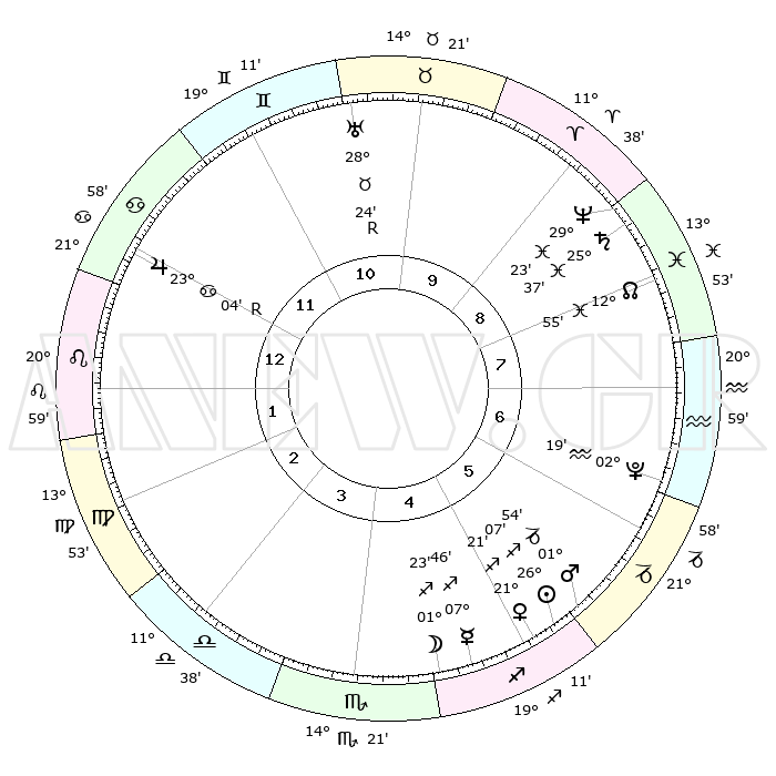 | | ΘΕΣΕΙΣ ΠΛΑΝΗΤΩΝ ΑΣΤΡΟΛΟΓΙΚΟΥ ΧΑΡΤΗ ΤΗΣ ΣΤΙΓΜΗΣ ΑΥΤΗΣ | | | | Πλανήτης | Ζώδιο | Μοίρες | Δεκαήμ. | Σε οίκο | Απόκλιση | | Ακμές των οίκων | | Ηλιος | Τοξότης | 26°01' | Τρίτο | 6 | 23 S 22 | | 1ος | 24°55' | Καρκίνος | | Σελήνη | Τοξότης | 00°19' | Πρώτο | 5 | 24 S 59 | | 2ος | 15°40' | Λέων | | Ερμής | Τοξότης | 07°39' | Πρώτο | 5 | 20 S 24 | | 3ος | 10°02' | Παρθένος | | Αφροδίτη | Τοξότης | 21°15' | Τρίτο | 5 | 23 S 05 | | 4ος | 10°23' | Ζυγός | | Αρης | Αιγόκερως | 01°50' | Πρώτο | 6 | 24 S 13 | | 5ος | 16°29' | Σκορπιός | | Δίας | Καρκίνος | 23°05'R | Τρίτο | 12 | 21 N 40 | | 6ος | 23°02' | Τοξότης | | Κρόνος | Ιχθείς | 25°37' | Τρίτο | 9 | 03 S 52 | | 7ος | 24°55' | Αιγόκερως | | Ουρανός | Ταύρος | 28°24'R | Τρίτο | 11 | 19 N 36 | | 8ος | 15°40' | Υδροχόος | | Ποσειδώνας | Ιχθείς | 29°23' | Τρίτο | 9 | 01 S 29 | | 9ος | 10°02' | Ιχθείς | | Πλούτωνας | Υδροχόος | 02°19' | Πρώτο | 7 | 23 S 18 | | 10ος | 10°23' | Κριός | | Β. Δεσμός | Ιχθείς | 12°56' | Δεύτερο | 9 | 06 S 42 | | 11ος | 16°29' | Ταύρος | | Ωροσκόπος | Καρκίνος | 24°55' | Τρίτο | | | 12ος | 23°02' | Δίδυμοι | | Μεσουράνημα | Κριός | 10°23' | Δεύτερο | | | |