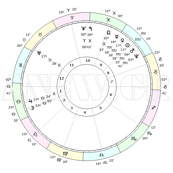 | | ΘΕΣΕΙΣ ΠΛΑΝΗΤΩΝ ΑΣΤΡΟΛΟΓΙΚΟΥ ΧΑΡΤΗ ΤΗΣ ΣΤΙΓΜΗΣ ΑΥΤΗΣ | | | | Πλανήτης | Ζώδιο | Μοίρες | Δεκαήμ. | Σε οίκο | Απόκλιση | | Ακμές των οίκων | | Ηλιος | Υδροχόος | 11°35' | Δεύτερο | 9 | 17 S 18 | | 1ος | 11°43' | Δίδυμοι | | Σελήνη | Καρκίνος | 22°13' | Τρίτο | 2 | 25 N 22 | | 2ος | 04°27' | Καρκίνος | | Ερμής | Υδροχόος | 18°33' | Δεύτερο | 9 | 17 S 05 | | 3ος | 25°39' | Καρκίνος | | Αφροδίτη | Υδροχόος | 17°31' | Δεύτερο | 9 | 16 S 52 | | 4ος | 19°29' | Λέων | | Αρης | Υδροχόος | 06°19' | Πρώτο | 9 | 19 S 42 | | 5ος | 20°05' | Παρθένος | | Δίας | Καρκίνος | 17°25'R | Δεύτερο | 2 | 22 N 36 | | 6ος | 29°58' | Ζυγός | | Κρόνος | Ιχθείς | 28°42' | Τρίτο | 11 | 02 S 31 | | 7ος | 11°43' | Τοξότης | | Ουρανός | Ταύρος | 27°28'R | Τρίτο | 12 | 19 N 24 | | 8ος | 04°27' | Αιγόκερως | | Ποσειδώνας | Κριός | 00°08' | Πρώτο | 11 | 01 S 09 | | 9ος | 25°39' | Αιγόκερως | | Πλούτωνας | Υδροχόος | 03°41' | Πρώτο | 9 | 23 S 01 | | 10ος | 19°29' | Υδροχόος | | Β. Δεσμός | Ιχθείς | 10°33' | Δεύτερο | 10 | 07 S 36 | | 11ος | 20°05' | Ιχθείς | | Ωροσκόπος | Δίδυμοι | 11°43' | Δεύτερο | | | 12ος | 29°58' | Κριός | | Μεσουράνημα | Υδροχόος | 19°29' | Δεύτερο | | | |