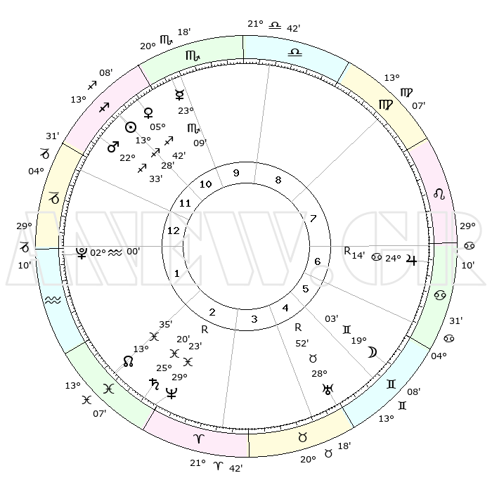 | | ΘΕΣΕΙΣ ΠΛΑΝΗΤΩΝ ΑΣΤΡΟΛΟΓΙΚΟΥ ΧΑΡΤΗ ΤΗΣ ΣΤΙΓΜΗΣ ΑΥΤΗΣ | | | | Πλανήτης | Ζώδιο | Μοίρες | Δεκαήμ. | Σε οίκο | Απόκλιση | | Ακμές των οίκων | | Ηλιος | Τοξότης | 13°26' | Δεύτερο | 11 | 22 S 24 | | 1ος | 15°23' | Αιγόκερως | | Σελήνη | Δίδυμοι | 18°31' | Δεύτερο | 5 | 27 N 54 | | 2ος | 26°26' | Υδροχόος | | Ερμής | Σκορπιός | 23°07' | Τρίτο | 10 | 16 S 06 | | 3ος | 06°32' | Κριός | | Αφροδίτη | Τοξότης | 05°39' | Πρώτο | 11 | 20 S 42 | | 4ος | 07°41' | Ταύρος | | Αρης | Τοξότης | 22°31' | Τρίτο | 11 | 23 S 55 | | 5ος | 01°51' | Δίδυμοι | | Δίας | Καρκίνος | 24°14'R | Τρίτο | 7 | 21 N 26 | | 6ος | 23°04' | Δίδυμοι | | Κρόνος | Ιχθείς | 25°20' | Τρίτο | 2 | 04 S 01 | | 7ος | 15°23' | Καρκίνος | | Ουρανός | Ταύρος | 28°52'R | Τρίτο | 4 | 19 N 42 | | 8ος | 26°26' | Λέων | | Ποσειδώνας | Ιχθείς | 29°23'R | Τρίτο | 2 | 01 S 29 | | 9ος | 06°32' | Ζυγός | | Πλούτωνας | Υδροχόος | 02°00' | Πρώτο | 1 | 23 S 23 | | 10ος | 07°41' | Σκορπιός | | Β. Δεσμός | Ιχθείς | 13°35' | Δεύτερο | 2 | 06 S 27 | | 11ος | 01°51' | Τοξότης | | Ωροσκόπος | Αιγόκερως | 15°23' | Δεύτερο | | | 12ος | 23°04' | Τοξότης | | Μεσουράνημα | Σκορπιός | 07°41' | Πρώτο | | | |
