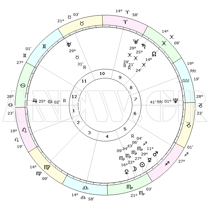 | | ΘΕΣΕΙΣ ΠΛΑΝΗΤΩΝ ΑΣΤΡΟΛΟΓΙΚΟΥ ΧΑΡΤΗ ΤΗΣ ΣΤΙΓΜΗΣ ΑΥΤΗΣ | | | | Πλανήτης | Ζώδιο | Μοίρες | Δεκαήμ. | Σε οίκο | Απόκλιση | | Ακμές των οίκων | | Ηλιος | Σκορπιός | 27°40' | Τρίτο | 5 | 19 S 38 | | 1ος | 10°50' | Καρκίνος | | Σελήνη | Σκορπιός | 21°53' | Τρίτο | 5 | 22 S 40 | | 2ος | 01°16' | Λέων | | Ερμής | Σκορπιός | 29°11'R | Τρίτο | 5 | 19 S 39 | | 3ος | 23°58' | Λέων | | Αφροδίτη | Σκορπιός | 16°04' | Δεύτερο | 5 | 15 S 37 | | 4ος | 22°05' | Παρθένος | | Αρης | Τοξότης | 11°01' | Δεύτερο | 6 | 22 S 39 | | 5ος | 27°27' | Ζυγός | | Δίας | Καρκίνος | 25°03'R | Τρίτο | 1 | 21 N 15 | | 6ος | 06°16' | Τοξότης | | Κρόνος | Ιχθείς | 25°21'R | Τρίτο | 10 | 04 S 04 | | 7ος | 10°50' | Αιγόκερως | | Ουρανός | Ταύρος | 29°31'R | Τρίτο | 11 | 19 N 50 | | 8ος | 01°16' | Υδροχόος | | Ποσειδώνας | Ιχθείς | 29°29'R | Τρίτο | 10 | 01 S 27 | | 9ος | 23°58' | Υδροχόος | | Πλούτωνας | Υδροχόος | 01°41' | Πρώτο | 8 | 23 S 27 | | 10ος | 22°05' | Ιχθείς | | Β. Δεσμός | Ιχθείς | 14°24' | Δεύτερο | 9 | 06 S 08 | | 11ος | 27°27' | Κριός | | Ωροσκόπος | Καρκίνος | 10°50' | Δεύτερο | | | 12ος | 06°16' | Δίδυμοι | | Μεσουράνημα | Ιχθείς | 22°05' | Τρίτο | | | |