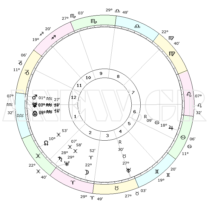 | | ΘΕΣΕΙΣ ΠΛΑΝΗΤΩΝ ΑΣΤΡΟΛΟΓΙΚΟΥ ΧΑΡΤΗ ΤΗΣ ΣΤΙΓΜΗΣ ΑΥΤΗΣ | | | | Πλανήτης | Ζώδιο | Μοίρες | Δεκαήμ. | Σε οίκο | Απόκλιση | | Ακμές των οίκων | | Ηλιος | Υδροχόος | 05°11' | Πρώτο | 1 | 18 S 58 | | 1ος | 09°12' | Αιγόκερως | | Σελήνη | Κριός | 21°54' | Τρίτο | 3 | 11 N 48 | | 2ος | 18°43' | Υδροχόος | | Ερμής | Υδροχόος | 07°35' | Πρώτο | 1 | 20 S 23 | | 3ος | 29°01' | Ιχθείς | | Αφροδίτη | Υδροχόος | 09°37' | Πρώτο | 1 | 19 S 02 | | 4ος | 01°20' | Ταύρος | | Αρης | Υδροχόος | 01°24' | Πρώτο | 1 | 20 S 50 | | 5ος | 26°17' | Ταύρος | | Δίας | Καρκίνος | 18°10'R | Δεύτερο | 7 | 22 N 29 | | 6ος | 17°39' | Δίδυμοι | | Κρόνος | Ιχθείς | 28°07' | Τρίτο | 2 | 02 S 46 | | 7ος | 09°12' | Καρκίνος | | Ουρανός | Ταύρος | 27°30'R | Τρίτο | 5 | 19 N 25 | | 8ος | 18°43' | Λέων | | Ποσειδώνας | Ιχθείς | 29°58' | Τρίτο | 3 | 01 S 13 | | 9ος | 29°01' | Παρθένος | | Πλούτωνας | Υδροχόος | 03°29' | Πρώτο | 1 | 23 S 04 | | 10ος | 01°20' | Σκορπιός | | Β. Δεσμός | Ιχθείς | 10°53' | Δεύτερο | 2 | 07 S 29 | | 11ος | 26°17' | Σκορπιός | | Ωροσκόπος | Αιγόκερως | 09°12' | Πρώτο | | | 12ος | 17°39' | Τοξότης | | Μεσουράνημα | Σκορπιός | 01°20' | Πρώτο | | | |