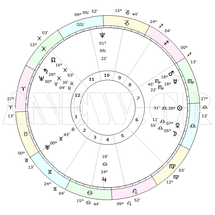 | ΘΕΣΕΙΣ ΠΛΑΝΗΤΩΝ ΑΣΤΡΟΛΟΓΙΚΟΥ ΧΑΡΤΗ ΤΗΣ ΣΤΙΓΜΗΣ ΑΥΤΗΣ | | Πλανήτης | Ζώδιο | Μοίρες | Δεκαήμ. | Σε οίκο | Απόκλιση | | Ακμές των οίκων | Ηλιος | Ζυγός | 26°24' | Τρίτο | 8 | 10 S 11 | | 1ος | 23°59' | Υδροχόος | Σελήνη | Ζυγός | 04°33' | Πρώτο | 7 | 03 S 10 | | 2ος | 09°44' | Κριός | Ερμής | Σκορπιός | 18°13' | Δεύτερο | 9 | 19 S 21 | | 3ος | 13°39' | Ταύρος | Αφροδίτη | Ζυγός | 07°02' | Πρώτο | 7 | 01 S 23 | | 4ος | 08°41' | Δίδυμοι | Αρης | Σκορπιός | 18°41' | Δεύτερο | 9 | 17 S 38 | | 5ος | 00°26' | Καρκίνος | Δίας | Καρκίνος | 24°17' | Τρίτο | 6 | 21 N 19 | | 6ος | 23°25' | Καρκίνος | Κρόνος | Ιχθείς | 26°36'R | Τρίτο | 1 | 03 S 39 | | 7ος | 23°59' | Λέων | Ουρανός | Δίδυμοι | 00°43'R | Πρώτο | 3 | 20 N 05 | | 8ος | 09°44' | Ζυγός | Ποσειδώνας | Κριός | 00°04'R | Πρώτο | 1 | 01 S 14 | | 9ος | 13°39' | Σκορπιός | Πλούτωνας | Υδροχόος | 01°22' | Πρώτο | 12 | 23 S 32 | | 10ος | 08°41' | Τοξότης | Β. Δεσμός | Ιχθείς | 16°04' | Δεύτερο | 1 | 05 S 30 | | 11ος | 00°26' | Αιγόκερως | Ωροσκόπος | Υδροχόος | 23°59' | Τρίτο | | | 12ος | 23°25' | Αιγόκερως | Μεσουράνημα | Τοξότης | 08°41' | Πρώτο | | | |