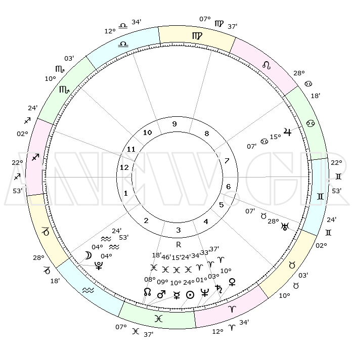 | | ΘΕΣΕΙΣ ΠΛΑΝΗΤΩΝ ΑΣΤΡΟΛΟΓΙΚΟΥ ΧΑΡΤΗ ΤΗΣ ΣΤΙΓΜΗΣ ΑΥΤΗΣ | | | | Πλανήτης | Ζώδιο | Μοίρες | Δεκαήμ. | Σε οίκο | Απόκλιση | | Ακμές των οίκων | | Ηλιος | Ιχθείς | 24°21' | Τρίτο | 4 | 02 S 15 | | 1ος | 05°07' | Τοξότης | | Σελήνη | Υδροχόος | 03°40' | Πρώτο | 2 | 22 S 17 | | 2ος | 07°01' | Αιγόκερως | | Ερμής | Ιχθείς | 10°17'R | Δεύτερο | 3 | 05 S 27 | | 3ος | 13°34' | Υδροχόος | | Αφροδίτη | Κριός | 10°33' | Δεύτερο | 4 | 03 N 13 | | 4ος | 19°40' | Ιχθείς | | Αρης | Ιχθείς | 09°44' | Πρώτο | 3 | 08 S 56 | | 5ος | 20°01' | Κριός | | Δίας | Καρκίνος | 15°07' | Δεύτερο | 8 | 22 N 56 | | 6ος | 14°23' | Ταύρος | | Κρόνος | Κριός | 03°32' | Πρώτο | 4 | 00 S 33 | | 7ος | 05°07' | Δίδυμοι | | Ουρανός | Ταύρος | 28°07' | Τρίτο | 6 | 19 N 34 | | 8ος | 07°01' | Καρκίνος | | Ποσειδώνας | Κριός | 01°34' | Πρώτο | 4 | 00 S 35 | | 9ος | 13°34' | Λέων | | Πλούτωνας | Υδροχόος | 04°53' | Πρώτο | 2 | 22 S 49 | | 10ος | 19°40' | Παρθένος | | Β. Δεσμός | Ιχθείς | 08°18' | Πρώτο | 3 | 08 S 27 | | 11ος | 20°01' | Ζυγός | | Ωροσκόπος | Τοξότης | 05°07' | Πρώτο | | | 12ος | 14°23' | Σκορπιός | | Μεσουράνημα | Παρθένος | 19°40' | Δεύτερο | | | |