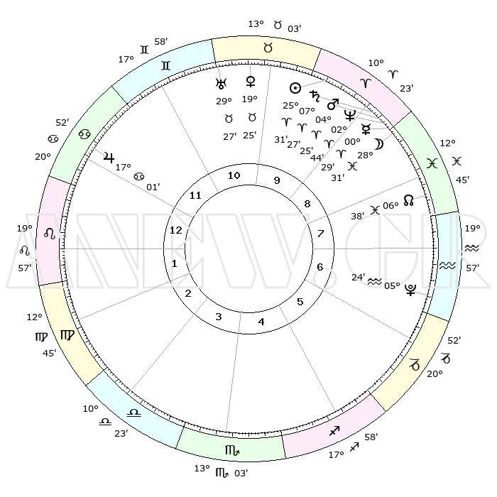 | | ΘΕΣΕΙΣ ΠΛΑΝΗΤΩΝ ΑΣΤΡΟΛΟΓΙΚΟΥ ΧΑΡΤΗ ΤΗΣ ΣΤΙΓΜΗΣ ΑΥΤΗΣ | | | | Πλανήτης | Ζώδιο | Μοίρες | Δεκαήμ. | Σε οίκο | Απόκλιση | | Ακμές των οίκων | | Ηλιος | Κριός | 25°27' | Τρίτο | 10 | 09 N 50 | | 1ος | 28°47' | Καρκίνος | | Σελήνη | Ιχθείς | 27°30' | Τρίτο | 9 | 00 N 35 | | 2ος | 19°45' | Λέων | | Ερμής | Κριός | 00°23' | Πρώτο | 9 | 02 S 14 | | 3ος | 14°38' | Παρθένος | | Αφροδίτη | Ταύρος | 19°20' | Δεύτερο | 10 | 17 N 44 | | 4ος | 15°30' | Ζυγός | | Αρης | Κριός | 04°21' | Πρώτο | 9 | 00 N 50 | | 5ος | 21°35' | Σκορπιός | | Δίας | Καρκίνος | 17°00' | Δεύτερο | 12 | 22 N 44 | | 6ος | 27°29' | Τοξότης | | Κρόνος | Κριός | 07°26' | Πρώτο | 9 | 00 N 59 | | 7ος | 28°47' | Αιγόκερως | | Ουρανός | Ταύρος | 29°27' | Τρίτο | 11 | 19 N 52 | | 8ος | 19°45' | Υδροχόος | | Ποσειδώνας | Κριός | 02°44' | Πρώτο | 9 | 00 S 07 | | 9ος | 14°38' | Ιχθείς | | Πλούτωνας | Υδροχόος | 05°24' | Πρώτο | 7 | 22 S 47 | | 10ος | 15°30' | Κριός | | Β. Δεσμός | Ιχθείς | 06°38' | Πρώτο | 8 | 09 S 04 | | 11ος | 21°35' | Ταύρος | | Ωροσκόπος | Καρκίνος | 28°47' | Τρίτο | | | 12ος | 27°29' | Δίδυμοι | | Μεσουράνημα | Κριός | 15°30' | Δεύτερο | | | |