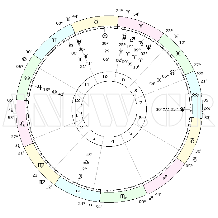 | | ΘΕΣΕΙΣ ΠΛΑΝΗΤΩΝ ΑΣΤΡΟΛΟΓΙΚΟΥ ΧΑΡΤΗ ΤΗΣ ΣΤΙΓΜΗΣ ΑΥΤΗΣ | | | | Πλανήτης | Ζώδιο | Μοίρες | Δεκαήμ. | Σε οίκο | Απόκλιση | | Ακμές των οίκων | | Ηλιος | Ταύρος | 09°03' | Πρώτο | 10 | 14 N 31 | | 1ος | 24°30' | Καρκίνος | | Σελήνη | Ζυγός | 12°16' | Δεύτερο | 4 | 07 S 32 | | 2ος | 15°13' | Λέων | | Ερμής | Κριός | 22°57' | Τρίτο | 10 | 06 N 59 | | 3ος | 09°32' | Παρθένος | | Αφροδίτη | Δίδυμοι | 06°18' | Πρώτο | 11 | 22 N 10 | | 4ος | 09°49' | Ζυγός | | Αρης | Κριός | 15°07' | Δεύτερο | 10 | 05 N 08 | | 5ος | 15°55' | Σκορπιός | | Δίας | Καρκίνος | 18°41' | Δεύτερο | 12 | 22 N 31 | | 6ος | 22°33' | Τοξότης | | Κρόνος | Κριός | 09°04' | Πρώτο | 9 | 01 N 36 | | 7ος | 24°30' | Αιγόκερως | | Ουρανός | Δίδυμοι | 00°11' | Πρώτο | 11 | 20 N 01 | | 8ος | 15°13' | Υδροχόος | | Ποσειδώνας | Κριός | 03°13' | Πρώτο | 9 | 00 N 04 | | 9ος | 09°32' | Ιχθείς | | Πλούτωνας | Υδροχόος | 05°30' | Πρώτο | 7 | 22 S 49 | | 10ος | 09°50' | Κριός | | Β. Δεσμός | Ιχθείς | 05°54' | Πρώτο | 8 | 09 S 21 | | 11ος | 15°55' | Ταύρος | | Ωροσκόπος | Καρκίνος | 24°30' | Τρίτο | | | 12ος | 22°33' | Δίδυμοι | | Μεσουράνημα | Κριός | 09°50' | Πρώτο | | | |