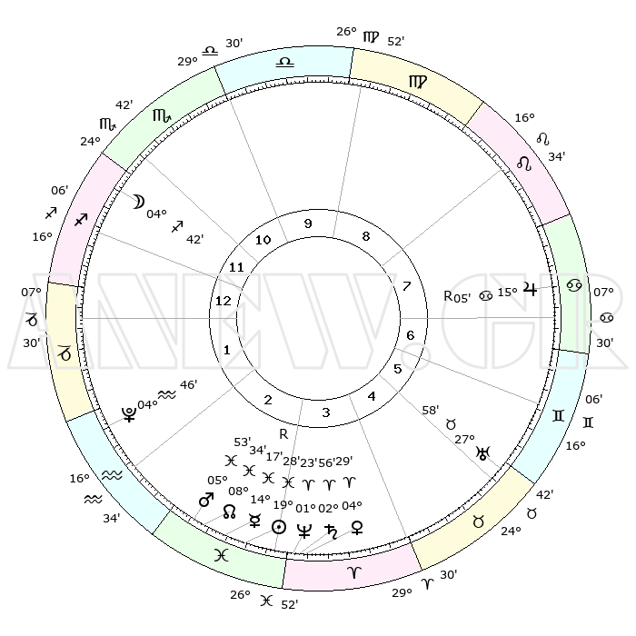 | | ΘΕΣΕΙΣ ΠΛΑΝΗΤΩΝ ΑΣΤΡΟΛΟΓΙΚΟΥ ΧΑΡΤΗ ΤΗΣ ΣΤΙΓΜΗΣ ΑΥΤΗΣ | | | | Πλανήτης | Ζώδιο | Μοίρες | Δεκαήμ. | Σε οίκο | Απόκλιση | | Ακμές των οίκων | | Ηλιος | Ιχθείς | 19°25' | Δεύτερο | 3 | 04 S 11 | | 1ος | 17°06' | Τοξότης | | Σελήνη | Τοξότης | 03°58' | Πρώτο | 12 | 26 S 06 | | 2ος | 21°14' | Αιγόκερως | | Ερμής | Ιχθείς | 14°20'R | Δεύτερο | 3 | 03 S 02 | | 3ος | 29°46' | Υδροχόος | | Αφροδίτη | Κριός | 04°24' | Πρώτο | 3 | 00 N 40 | | 4ος | 05°19' | Κριός | | Αρης | Ιχθείς | 05°50' | Πρώτο | 3 | 10 S 23 | | 5ος | 03°46' | Ταύρος | | Δίας | Καρκίνος | 15°05'R | Δεύτερο | 7 | 22 N 56 | | 6ος | 26°41' | Ταύρος | | Κρόνος | Κριός | 02°56' | Πρώτο | 3 | 00 S 47 | | 7ος | 17°06' | Δίδυμοι | | Ουρανός | Ταύρος | 27°58' | Τρίτο | 6 | 19 N 32 | | 8ος | 21°14' | Καρκίνος | | Ποσειδώνας | Κριός | 01°23' | Πρώτο | 3 | 00 S 39 | | 9ος | 29°46' | Λέων | | Πλούτωνας | Υδροχόος | 04°46' | Πρώτο | 2 | 22 S 50 | | 10ος | 05°19' | Ζυγός | | Β. Δεσμός | Ιχθείς | 08°34' | Πρώτο | 3 | 08 S 21 | | 11ος | 03°46' | Σκορπιός | | Ωροσκόπος | Τοξότης | 17°06' | Δεύτερο | | | 12ος | 26°41' | Σκορπιός | | Μεσουράνημα | Ζυγός | 05°19' | Πρώτο | | | |