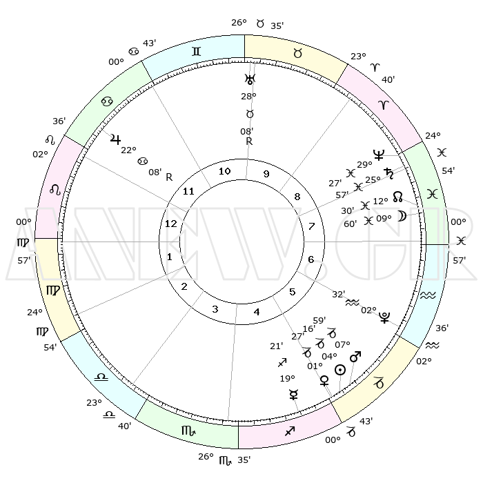 | | ΘΕΣΕΙΣ ΠΛΑΝΗΤΩΝ ΑΣΤΡΟΛΟΓΙΚΟΥ ΧΑΡΤΗ ΤΗΣ ΣΤΙΓΜΗΣ ΑΥΤΗΣ | | | | Πλανήτης | Ζώδιο | Μοίρες | Δεκαήμ. | Σε οίκο | Απόκλιση | | Ακμές των οίκων | | Ηλιος | Αιγόκερως | 04°12' | Πρώτο | 5 | 23 S 22 | | 1ος | 08°24' | Λέων | | Σελήνη | Ιχθείς | 08°59' | Πρώτο | 8 | 08 S 23 | | 2ος | 00°06' | Παρθένος | | Ερμής | Τοξότης | 19°15' | Δεύτερο | 5 | 22 S 50 | | 3ος | 26°17' | Παρθένος | | Αφροδίτη | Αιγόκερως | 01°21' | Πρώτο | 5 | 23 S 41 | | 4ος | 28°13' | Ζυγός | | Αρης | Αιγόκερως | 07°55' | Πρώτο | 5 | 24 S 03 | | 5ος | 03°55' | Τοξότης | | Δίας | Καρκίνος | 22°09'R | Τρίτο | 12 | 21 N 50 | | 6ος | 08°18' | Αιγόκερως | | Κρόνος | Ιχθείς | 25°57' | Τρίτο | 8 | 03 S 42 | | 7ος | 08°24' | Υδροχόος | | Ουρανός | Ταύρος | 28°08'R | Τρίτο | 10 | 19 N 33 | | 8ος | 00°06' | Ιχθείς | | Ποσειδώνας | Ιχθείς | 29°26' | Τρίτο | 9 | 01 S 27 | | 9ος | 26°17' | Ιχθείς | | Πλούτωνας | Υδροχόος | 02°32' | Πρώτο | 6 | 23 S 15 | | 10ος | 28°13' | Κριός | | Β. Δεσμός | Ιχθείς | 12°30' | Δεύτερο | 8 | 06 S 52 | | 11ος | 03°55' | Δίδυμοι | | Ωροσκόπος | Λέων | 08°24' | Πρώτο | | | 12ος | 08°18' | Καρκίνος | | Μεσουράνημα | Κριός | 28°13' | Τρίτο | | | |