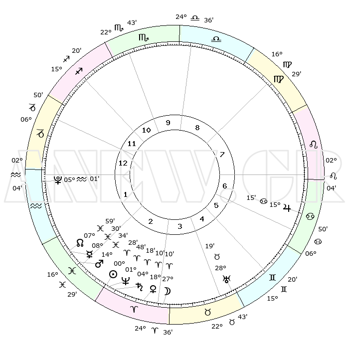 | | ΘΕΣΕΙΣ ΠΛΑΝΗΤΩΝ ΑΣΤΡΟΛΟΓΙΚΟΥ ΧΑΡΤΗ ΤΗΣ ΣΤΙΓΜΗΣ ΑΥΤΗΣ | | | | Πλανήτης | Ζώδιο | Μοίρες | Δεκαήμ. | Σε οίκο | Απόκλιση | | Ακμές των οίκων | | Ηλιος | Κριός | 00°24' | Πρώτο | 3 | 00 N 09 | | 1ος | 03°43' | Αιγόκερως | | Σελήνη | Κριός | 26°06' | Τρίτο | 4 | 13 N 40 | | 2ος | 11°49' | Υδροχόος | | Ερμής | Ιχθείς | 08°30' | Πρώτο | 2 | 07 S 31 | | 3ος | 22°02' | Ιχθείς | | Αφροδίτη | Κριός | 18°05' | Δεύτερο | 3 | 06 N 18 | | 4ος | 25°21' | Κριός | | Αρης | Ιχθείς | 14°30' | Δεύτερο | 2 | 07 S 05 | | 5ος | 21°05' | Ταύρος | | Δίας | Καρκίνος | 15°15' | Δεύτερο | 7 | 22 N 55 | | 6ος | 12°40' | Δίδυμοι | | Κρόνος | Κριός | 04°17' | Πρώτο | 3 | 00 S 15 | | 7ος | 03°43' | Καρκίνος | | Ουρανός | Ταύρος | 28°19' | Τρίτο | 5 | 19 N 37 | | 8ος | 11°49' | Λέων | | Ποσειδώνας | Κριός | 01°48' | Πρώτο | 3 | 00 S 29 | | 9ος | 22°02' | Παρθένος | | Πλούτωνας | Υδροχόος | 05°01' | Πρώτο | 1 | 22 S 48 | | 10ος | 25°21' | Ζυγός | | Β. Δεσμός | Ιχθείς | 07°59' | Πρώτο | 2 | 08 S 34 | | 11ος | 21°05' | Σκορπιός | | Ωροσκόπος | Αιγόκερως | 03°43' | Πρώτο | | | 12ος | 12°40' | Τοξότης | | Μεσουράνημα | Ζυγός | 25°21' | Τρίτο | | | |