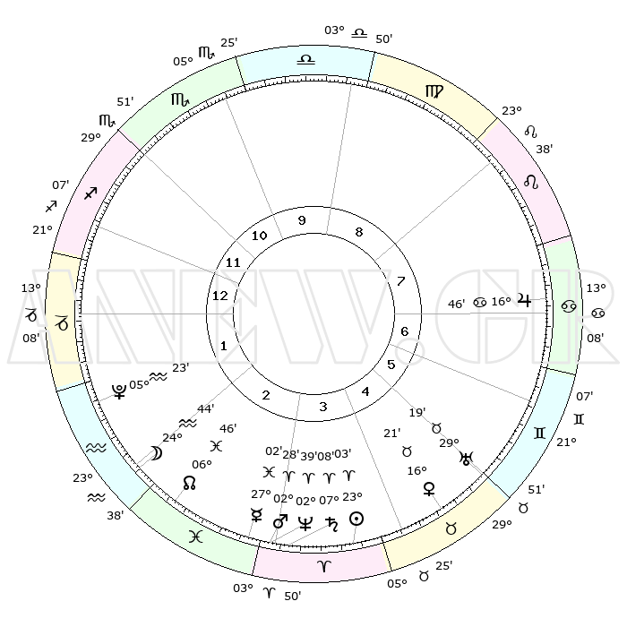 | | ΘΕΣΕΙΣ ΠΛΑΝΗΤΩΝ ΑΣΤΡΟΛΟΓΙΚΟΥ ΧΑΡΤΗ ΤΗΣ ΣΤΙΓΜΗΣ ΑΥΤΗΣ | | | | Πλανήτης | Ζώδιο | Μοίρες | Δεκαήμ. | Σε οίκο | Απόκλιση | | Ακμές των οίκων | | Ηλιος | Κριός | 22°59' | Τρίτο | 4 | 08 N 56 | | 1ος | 19°50' | Τοξότης | | Σελήνη | Υδροχόος | 23°50' | Τρίτο | 2 | 14 S 47 | | 2ος | 24°33' | Αιγόκερως | | Ερμής | Ιχθείς | 26°56' | Τρίτο | 3 | 03 S 31 | | 3ος | 03°29' | Ιχθείς | | Αφροδίτη | Ταύρος | 16°15' | Δεύτερο | 5 | 16 N 46 | | 4ος | 08°46' | Κριός | | Αρης | Κριός | 02°24' | Πρώτο | 3 | 00 N 03 | | 5ος | 06°46' | Ταύρος | | Δίας | Καρκίνος | 16°45' | Δεύτερο | 7 | 22 N 45 | | 6ος | 29°24' | Ταύρος | | Κρόνος | Κριός | 07°08' | Πρώτο | 3 | 00 N 52 | | 7ος | 19°50' | Δίδυμοι | | Ουρανός | Ταύρος | 29°19' | Τρίτο | 5 | 19 N 50 | | 8ος | 24°33' | Καρκίνος | | Ποσειδώνας | Κριός | 02°39' | Πρώτο | 3 | 00 S 09 | | 9ος | 03°29' | Παρθένος | | Πλούτωνας | Υδροχόος | 05°23' | Πρώτο | 2 | 22 S 47 | | 10ος | 08°46' | Ζυγός | | Β. Δεσμός | Ιχθείς | 06°46' | Πρώτο | 3 | 09 S 01 | | 11ος | 06°46' | Σκορπιός | | Ωροσκόπος | Τοξότης | 19°50' | Δεύτερο | | | 12ος | 29°24' | Σκορπιός | | Μεσουράνημα | Ζυγός | 08°46' | Πρώτο | | | |
