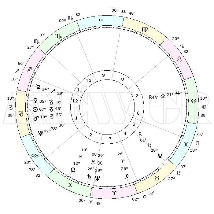 | | ΘΕΣΕΙΣ ΠΛΑΝΗΤΩΝ ΑΣΤΡΟΛΟΓΙΚΟΥ ΧΑΡΤΗ ΤΗΣ ΣΤΙΓΜΗΣ ΑΥΤΗΣ | | | | Πλανήτης | Ζώδιο | Μοίρες | Δεκαήμ. | Σε οίκο | Απόκλιση | | Ακμές των οίκων | | Ηλιος | Αιγόκερως | 07°42' | Πρώτο | 1 | 23 S 13 | | 1ος | 19°00' | Τοξότης | | Σελήνη | Κριός | 25°30' | Τρίτο | 4 | 13 N 10 | | 2ος | 23°33' | Αιγόκερως | | Ερμής | Τοξότης | 24°23' | Τρίτο | 1 | 23 S 34 | | 3ος | 02°21' | Ιχθείς | | Αφροδίτη | Αιγόκερως | 05°40' | Πρώτο | 1 | 23 S 43 | | 4ος | 07°44' | Κριός | | Αρης | Αιγόκερως | 10°32' | Δεύτερο | 1 | 23 S 53 | | 5ος | 05°52' | Ταύρος | | Δίας | Καρκίνος | 21°43'R | Τρίτο | 7 | 21 N 55 | | 6ος | 28°35' | Ταύρος | | Κρόνος | Ιχθείς | 26°08' | Τρίτο | 3 | 03 S 37 | | 7ος | 19°00' | Δίδυμοι | | Ουρανός | Ταύρος | 28°01'R | Τρίτο | 5 | 19 N 31 | | 8ος | 23°33' | Καρκίνος | | Ποσειδώνας | Ιχθείς | 29°29' | Τρίτο | 3 | 01 S 26 | | 9ος | 02°21' | Παρθένος | | Πλούτωνας | Υδροχόος | 02°38' | Πρώτο | 2 | 23 S 14 | | 10ος | 07°43' | Ζυγός | | Β. Δεσμός | Ιχθείς | 12°19' | Δεύτερο | 3 | 06 S 56 | | 11ος | 05°52' | Σκορπιός | | Ωροσκόπος | Τοξότης | 19°00' | Δεύτερο | | | 12ος | 28°35' | Σκορπιός | | Μεσουράνημα | Ζυγός | 07°43' | Πρώτο | | | |
