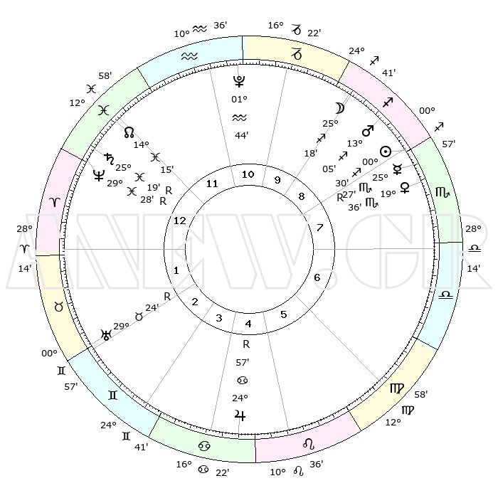 | | ΘΕΣΕΙΣ ΠΛΑΝΗΤΩΝ ΑΣΤΡΟΛΟΓΙΚΟΥ ΧΑΡΤΗ ΤΗΣ ΣΤΙΓΜΗΣ ΑΥΤΗΣ | | | | Πλανήτης | Ζώδιο | Μοίρες | Δεκαήμ. | Σε οίκο | Απόκλιση | | Ακμές των οίκων | | Ηλιος | Τοξότης | 00°27' | Πρώτο | 8 | 20 S 14 | | 1ος | 25°00' | Ιχθείς | | Σελήνη | Τοξότης | 24°37' | Τρίτο | 9 | 28 S 15 | | 2ος | 06°28' | Ταύρος | | Ερμής | Σκορπιός | 25°31'R | Τρίτο | 8 | 17 S 57 | | 3ος | 04°39' | Δίδυμοι | | Αφροδίτη | Σκορπιός | 19°32' | Δεύτερο | 8 | 16 S 39 | | 4ος | 27°12' | Δίδυμοι | | Αρης | Τοξότης | 13°02' | Δεύτερο | 9 | 22 S 57 | | 5ος | 19°18' | Καρκίνος | | Δίας | Καρκίνος | 24°57'R | Τρίτο | 5 | 21 N 16 | | 6ος | 15°57' | Λέων | | Κρόνος | Ιχθείς | 25°19'R | Τρίτο | 1 | 04 S 04 | | 7ος | 25°00' | Παρθένος | | Ουρανός | Ταύρος | 29°24'R | Τρίτο | 2 | 19 N 49 | | 8ος | 06°28' | Σκορπιός | | Ποσειδώνας | Ιχθείς | 29°28'R | Τρίτο | 1 | 01 S 28 | | 9ος | 04°39' | Τοξότης | | Πλούτωνας | Υδροχόος | 01°44' | Πρώτο | 11 | 23 S 26 | | 10ος | 27°12' | Τοξότης | | Β. Δεσμός | Ιχθείς | 14°16' | Δεύτερο | 12 | 06 S 12 | | 11ος | 19°18' | Αιγόκερως | | Ωροσκόπος | Ιχθείς | 25°00' | Τρίτο | | | 12ος | 15°57' | Υδροχόος | | Μεσουράνημα | Τοξότης | 27°12' | Τρίτο | | | |