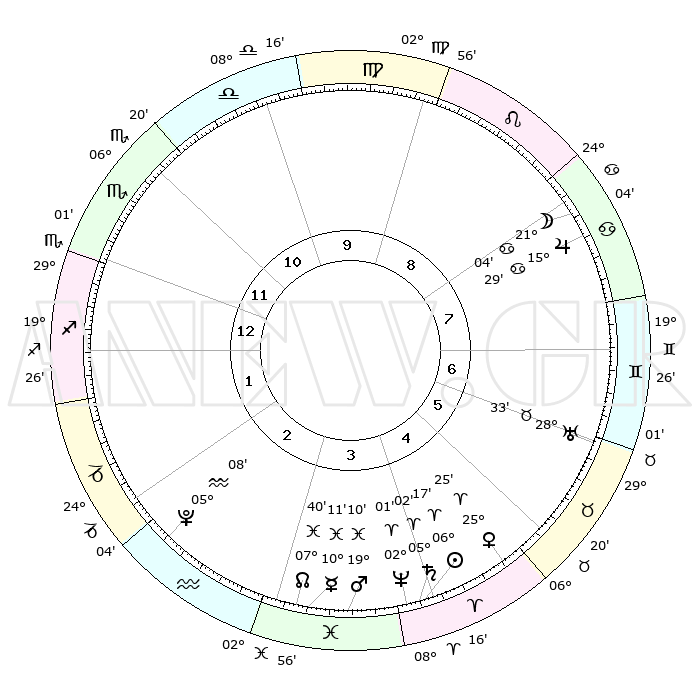 | | ΘΕΣΕΙΣ ΠΛΑΝΗΤΩΝ ΑΣΤΡΟΛΟΓΙΚΟΥ ΧΑΡΤΗ ΤΗΣ ΣΤΙΓΜΗΣ ΑΥΤΗΣ | | | | Πλανήτης | Ζώδιο | Μοίρες | Δεκαήμ. | Σε οίκο | Απόκλιση | | Ακμές των οίκων | | Ηλιος | Κριός | 06°13' | Πρώτο | 4 | 02 N 28 | | 1ος | 00°52' | Τοξότης | | Σελήνη | Καρκίνος | 20°13' | Τρίτο | 8 | 25 N 47 | | 2ος | 02°07' | Αιγόκερως | | Ερμής | Ιχθείς | 10°09' | Δεύτερο | 3 | 08 S 07 | | 3ος | 07°58' | Υδροχόος | | Αφροδίτη | Κριός | 25°20' | Τρίτο | 5 | 09 N 12 | | 4ος | 14°02' | Ιχθείς | | Αρης | Ιχθείς | 19°07' | Δεύτερο | 4 | 05 S 17 | | 5ος | 14°57' | Κριός | | Δίας | Καρκίνος | 15°29' | Δεύτερο | 8 | 22 N 54 | | 6ος | 09°53' | Ταύρος | | Κρόνος | Κριός | 05°01' | Πρώτο | 4 | 00 N 03 | | 7ος | 00°52' | Δίδυμοι | | Ουρανός | Ταύρος | 28°33' | Τρίτο | 6 | 19 N 40 | | 8ος | 02°07' | Καρκίνος | | Ποσειδώνας | Κριός | 02°01' | Πρώτο | 4 | 00 S 24 | | 9ος | 07°58' | Λέων | | Πλούτωνας | Υδροχόος | 05°08' | Πρώτο | 2 | 22 S 48 | | 10ος | 14°02' | Παρθένος | | Β. Δεσμός | Ιχθείς | 07°40' | Πρώτο | 3 | 08 S 41 | | 11ος | 14°57' | Ζυγός | | Ωροσκόπος | Τοξότης | 00°52' | Πρώτο | | | 12ος | 09°53' | Σκορπιός | | Μεσουράνημα | Παρθένος | 14°02' | Δεύτερο | | | |