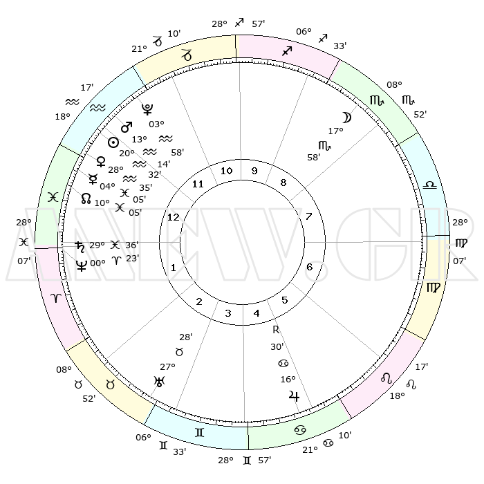 | | ΘΕΣΕΙΣ ΠΛΑΝΗΤΩΝ ΑΣΤΡΟΛΟΓΙΚΟΥ ΧΑΡΤΗ ΤΗΣ ΣΤΙΓΜΗΣ ΑΥΤΗΣ | | | | Πλανήτης | Ζώδιο | Μοίρες | Δεκαήμ. | Σε οίκο | Απόκλιση | | Ακμές των οίκων | | Ηλιος | Υδροχόος | 20°28' | Τρίτο | 12 | 14 S 40 | | 1ος | 21°15' | Υδροχόος | | Σελήνη | Σκορπιός | 17°11' | Δεύτερο | 9 | 21 S 38 | | 2ος | 07°03' | Κριός | | Ερμής | Ιχθείς | 03°58' | Πρώτο | 1 | 11 S 00 | | 3ος | 11°31' | Ταύρος | | Αφροδίτη | Υδροχόος | 28°30' | Τρίτο | 1 | 13 S 21 | | 4ος | 06°52' | Δίδυμοι | | Αρης | Υδροχόος | 13°11' | Δεύτερο | 12 | 17 S 53 | | 5ος | 28°40' | Δίδυμοι | | Δίας | Καρκίνος | 16°31'R | Δεύτερο | 5 | 22 N 44 | | 6ος | 21°24' | Καρκίνος | | Κρόνος | Ιχθείς | 29°36' | Τρίτο | 1 | 02 S 08 | | 7ος | 21°15' | Λέων | | Ουρανός | Ταύρος | 27°28' | Τρίτο | 3 | 19 N 24 | | 8ος | 07°03' | Ζυγός | | Ποσειδώνας | Κριός | 00°23' | Πρώτο | 1 | 01 S 03 | | 9ος | 11°31' | Σκορπιός | | Πλούτωνας | Υδροχόος | 03°58' | Πρώτο | 12 | 22 S 58 | | 10ος | 06°52' | Τοξότης | | Β. Δεσμός | Ιχθείς | 10°06' | Δεύτερο | 1 | 07 S 47 | | 11ος | 28°40' | Τοξότης | | Ωροσκόπος | Υδροχόος | 21°15' | Τρίτο | | | 12ος | 21°24' | Αιγόκερως | | Μεσουράνημα | Τοξότης | 06°52' | Πρώτο | | | |