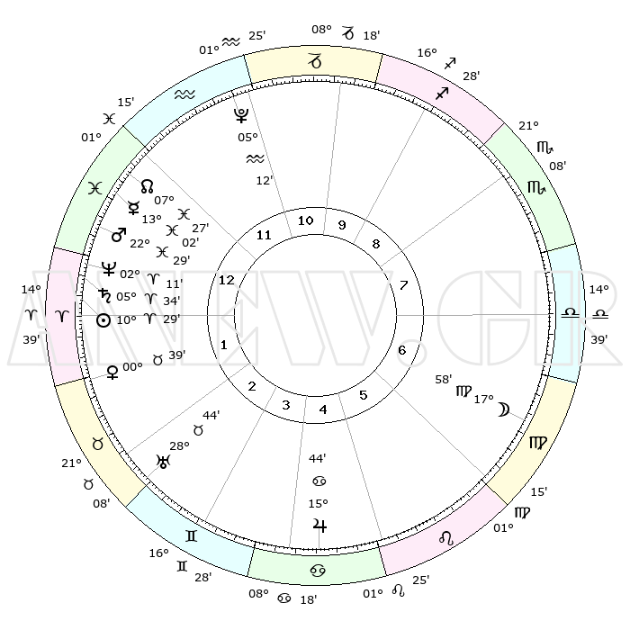 | | ΘΕΣΕΙΣ ΠΛΑΝΗΤΩΝ ΑΣΤΡΟΛΟΓΙΚΟΥ ΧΑΡΤΗ ΤΗΣ ΣΤΙΓΜΗΣ ΑΥΤΗΣ | | | | Πλανήτης | Ζώδιο | Μοίρες | Δεκαήμ. | Σε οίκο | Απόκλιση | | Ακμές των οίκων | | Ηλιος | Κριός | 10°25' | Δεύτερο | 1 | 04 N 07 | | 1ος | 08°14' | Ιχθείς | | Σελήνη | Παρθένος | 17°10' | Δεύτερο | 7 | 04 N 22 | | 2ος | 22°46' | Κριός | | Ερμής | Ιχθείς | 12°59' | Δεύτερο | 1 | 07 S 46 | | 3ος | 23°53' | Ταύρος | | Αφροδίτη | Ταύρος | 00°34' | Πρώτο | 2 | 11 N 13 | | 4ος | 17°33' | Δίδυμοι | | Αρης | Ιχθείς | 22°27' | Τρίτο | 1 | 03 S 58 | | 5ος | 09°15' | Καρκίνος | | Δίας | Καρκίνος | 15°43' | Δεύτερο | 5 | 22 N 52 | | 6ος | 03°43' | Λέων | | Κρόνος | Κριός | 05°33' | Πρώτο | 1 | 00 N 15 | | 7ος | 08°14' | Παρθένος | | Ουρανός | Ταύρος | 28°44' | Τρίτο | 3 | 19 N 42 | | 8ος | 22°46' | Ζυγός | | Ποσειδώνας | Κριός | 02°11' | Πρώτο | 1 | 00 S 20 | | 9ος | 23°53' | Σκορπιός | | Πλούτωνας | Υδροχόος | 05°12' | Πρώτο | 12 | 22 S 47 | | 10ος | 17°33' | Τοξότης | | Β. Δεσμός | Ιχθείς | 07°27' | Πρώτο | 12 | 08 S 46 | | 11ος | 09°15' | Αιγόκερως | | Ωροσκόπος | Ιχθείς | 08°14' | Πρώτο | | | 12ος | 03°43' | Υδροχόος | | Μεσουράνημα | Τοξότης | 17°33' | Δεύτερο | | | |